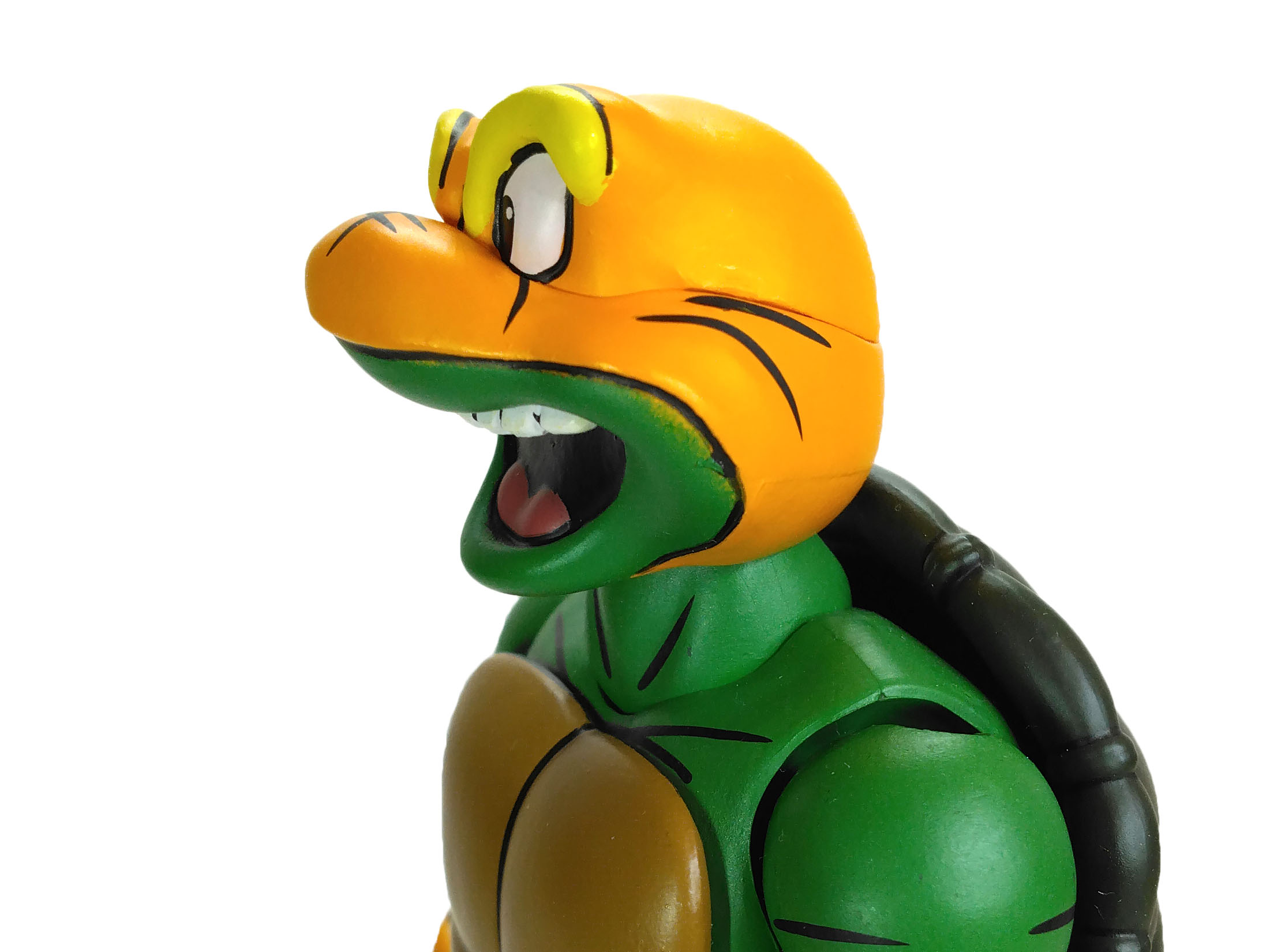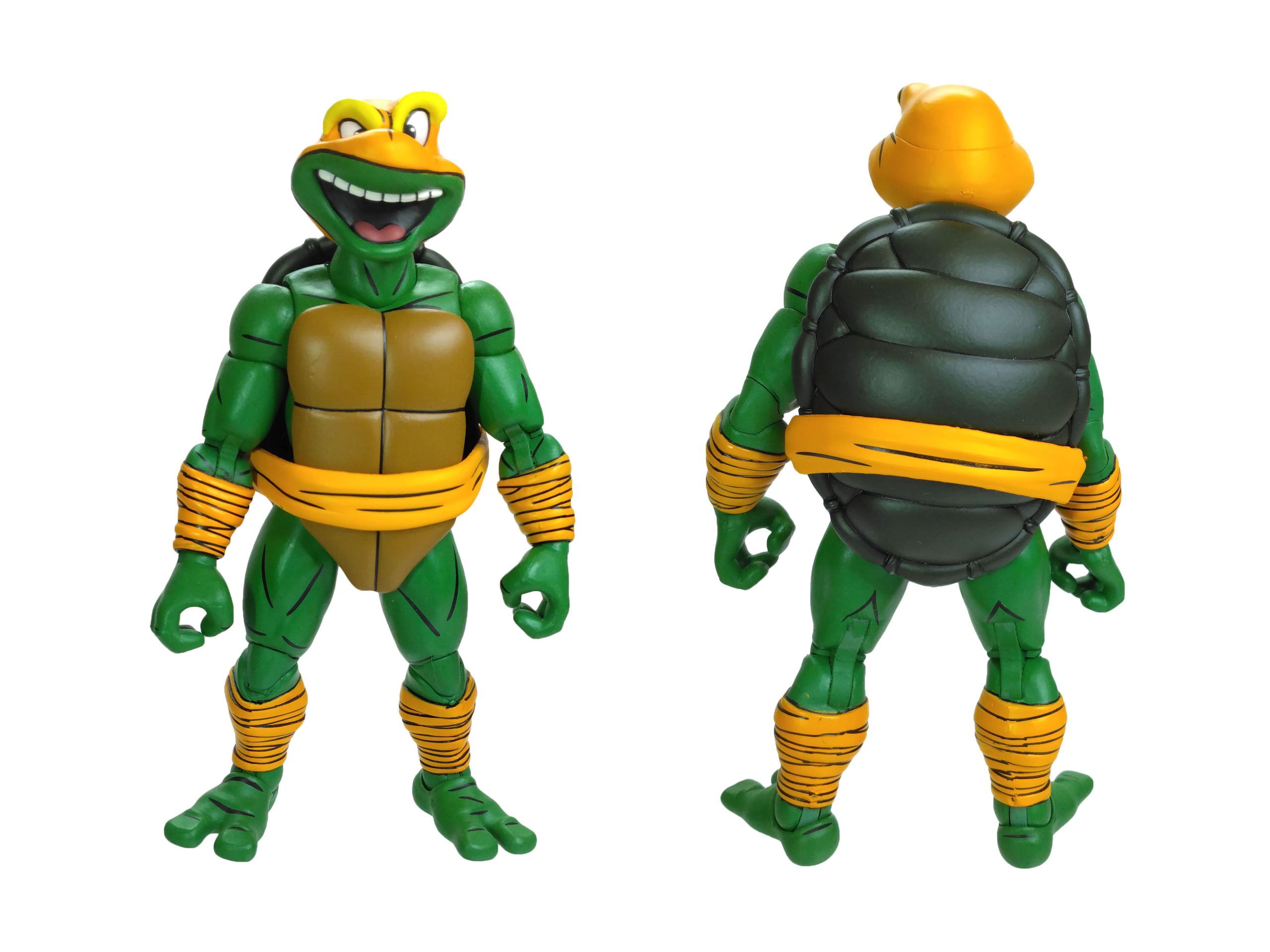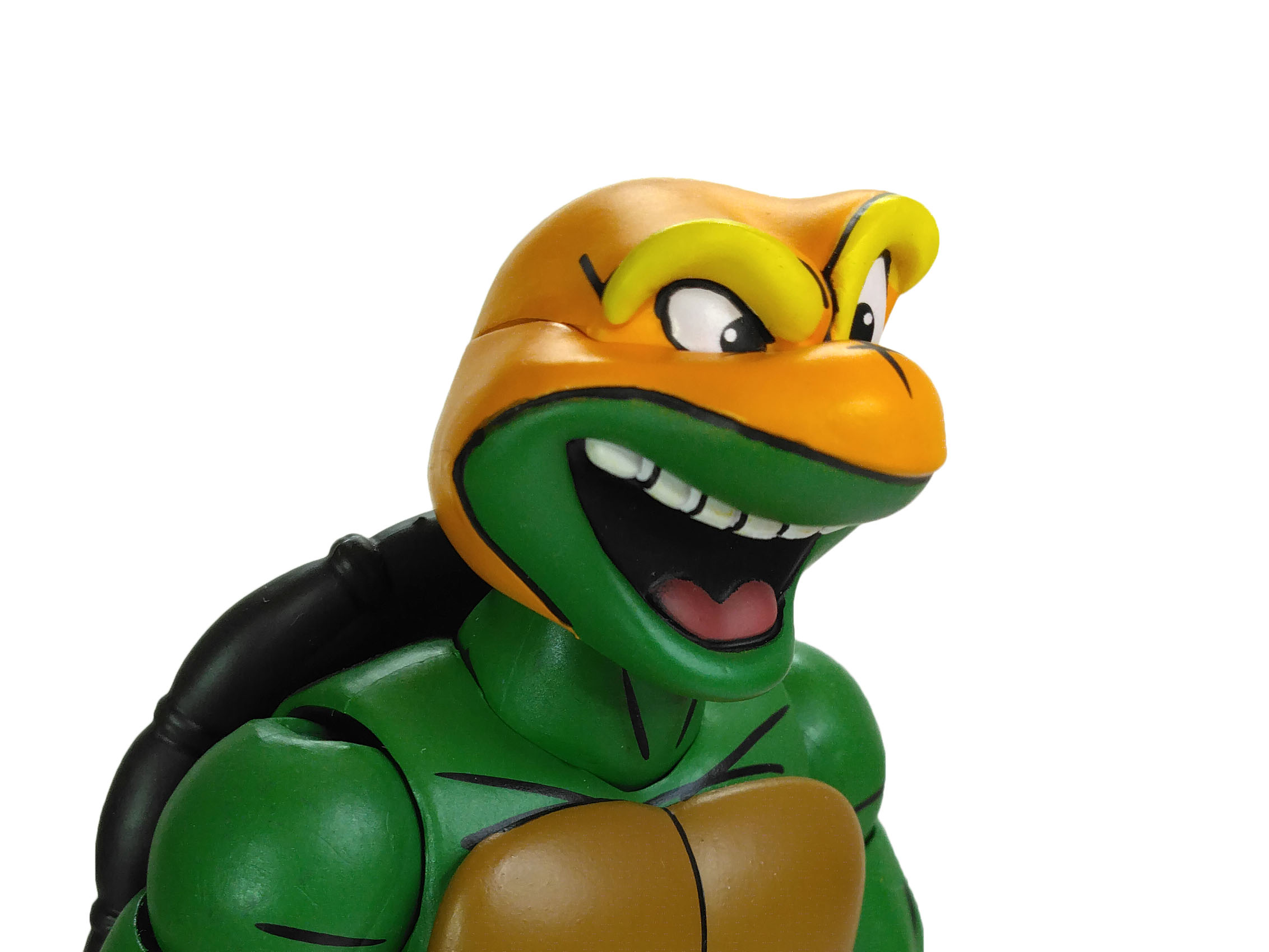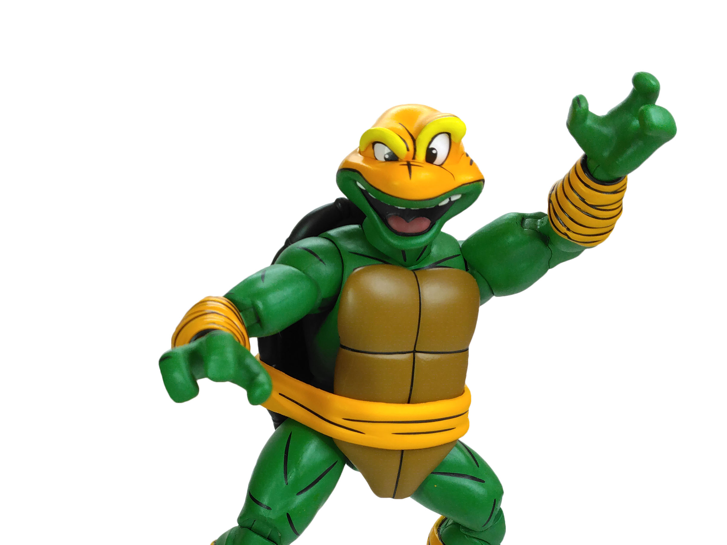 La sculpture générale du corps de Michelangelo est identique à celle des trois autres tortues. Celle-ci est totalement nouvelle, sculptée par Tony Cipriano et ne reprend en rien la sculpture des tortues du dessin animé de 1987. Cette figurine est d’ailleurs un petit peu plus grande et plus massive. Et j’ai un immense coup de cœur pour cette sculpture.