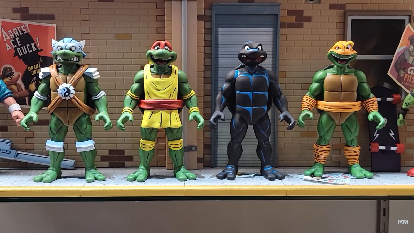 La sculpture de cette figurine est excellente. Le choix a été porté pour représenter ces tortues sous les traits de Ken Mitchroney, qui n’a pas signé le TMNT A. #7, mais le suivant, où nous pouvions encore les voir affublées de ces tenues que trois artistes auront représentés (TMNT A. #37). Et sincèrement, j’adore ce choix. Jim Lawson est un artiste qui, malgré son talent et son empreinte dans la licence, peine à réunir les fans. Ce sont déjà ses tortues qui ont été sélectionnées pour le comic de Mirage. Alors l’accent porté sur les très expressives tortues de Mitchroney est un choix totalement justifié.