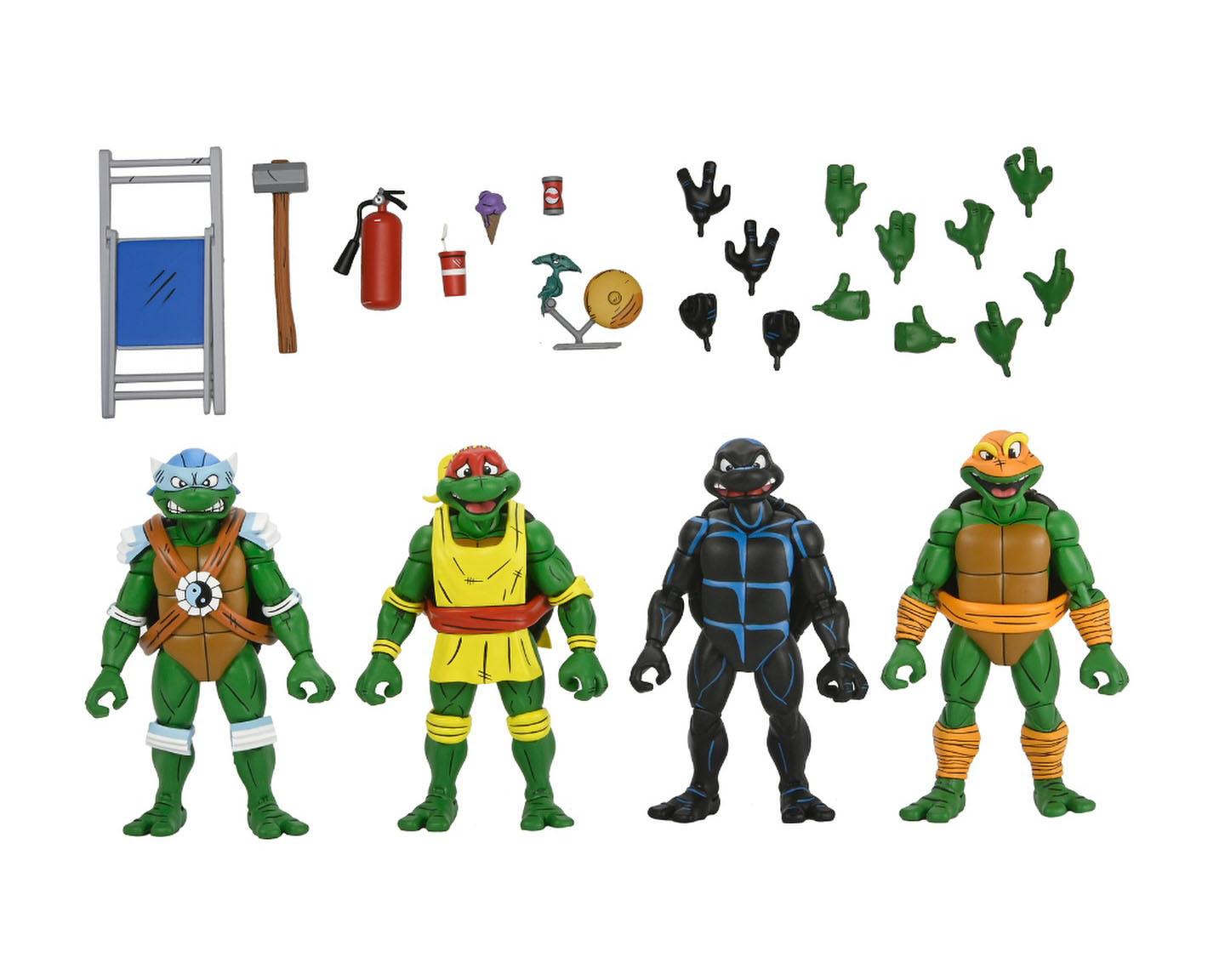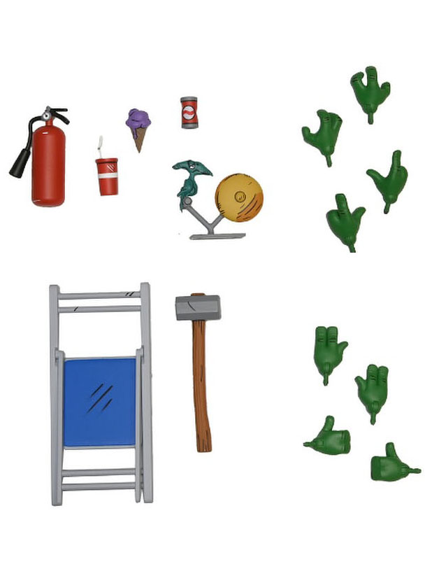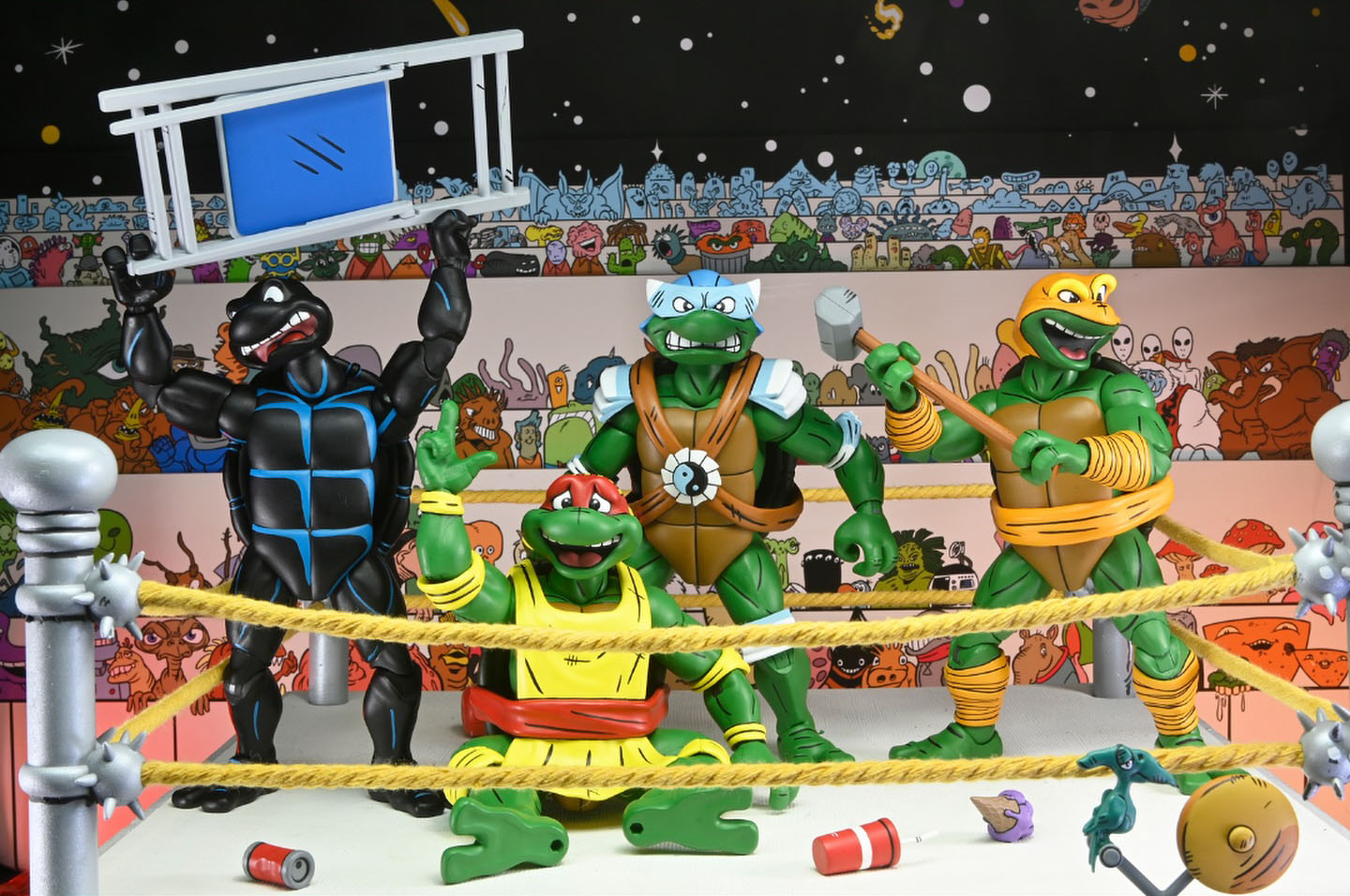 Dans ce pack, les tortues ne possèdent pas leurs propres armes. Stump les leur confisque à leur arrivée dans l’arène. À la place, NECA nous propose tout un arsenal propre à l’univers du catch.
