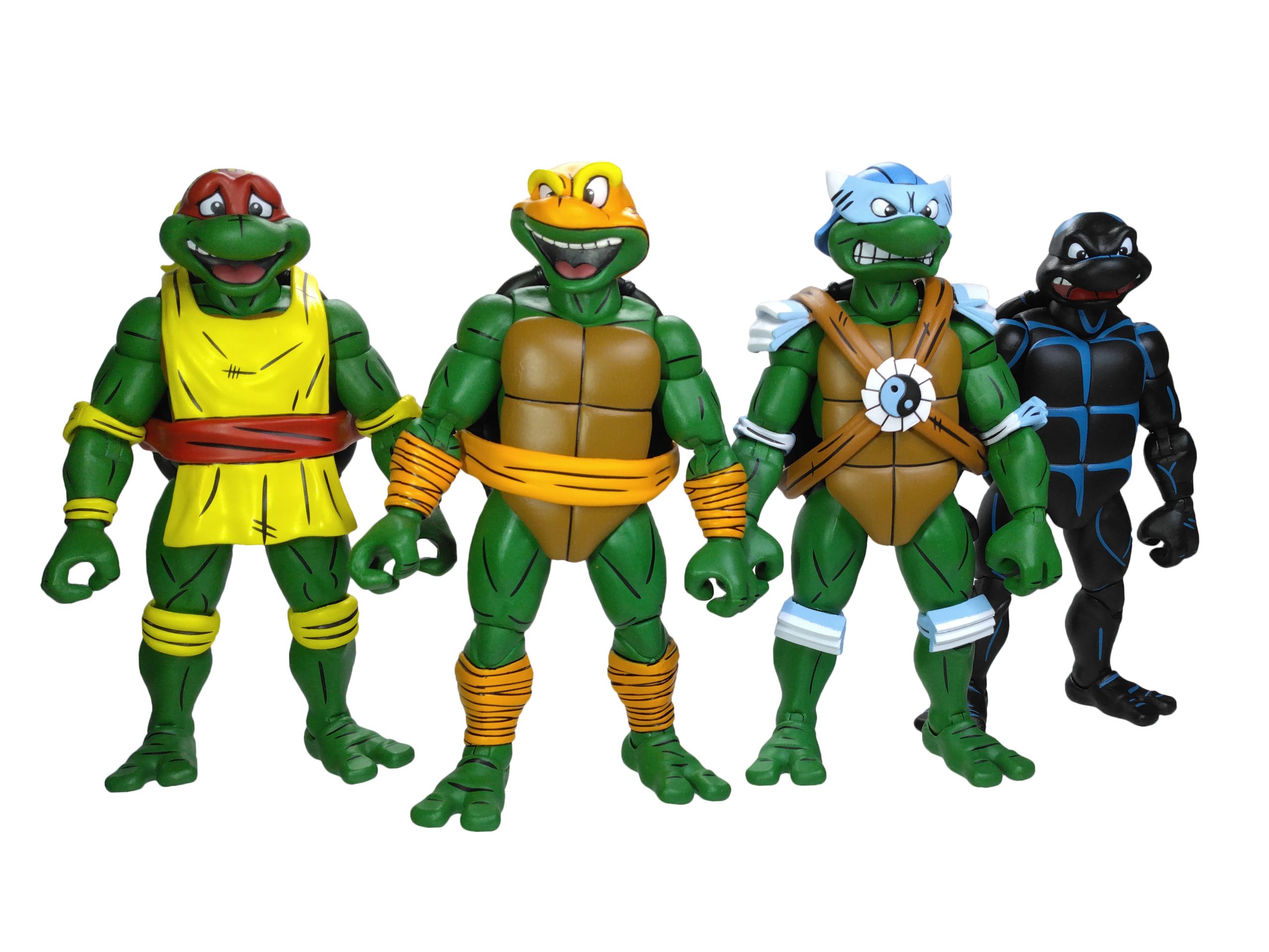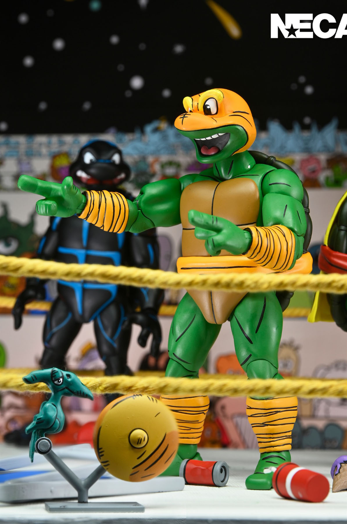 Les tortues en costumes de catch ont été dévoilées par NECA lors de la Comic Con de San Diego de 2023. Les modèles alors présentés étaient relativement avancé. On notait simplement l’absence d’articulations. Toutefois, Trevor Zammit a précisé que ces tortues seraient les premières à proposer des doubles articulations au niveau des coudes et des jambes (à l’instar des gammes The last ronin et de Mirage), afin de les distinguer totalement des modèles du dessin animé de 1987. Ces figurines proposent effectivement une sculpture entièrement nouvelle. En outre, elles possèdent un nouveau système d’articulations dont les vis sont dissimulées au niveau des jambes et des bras, ne laissant plus que les sections des membres apparentes.