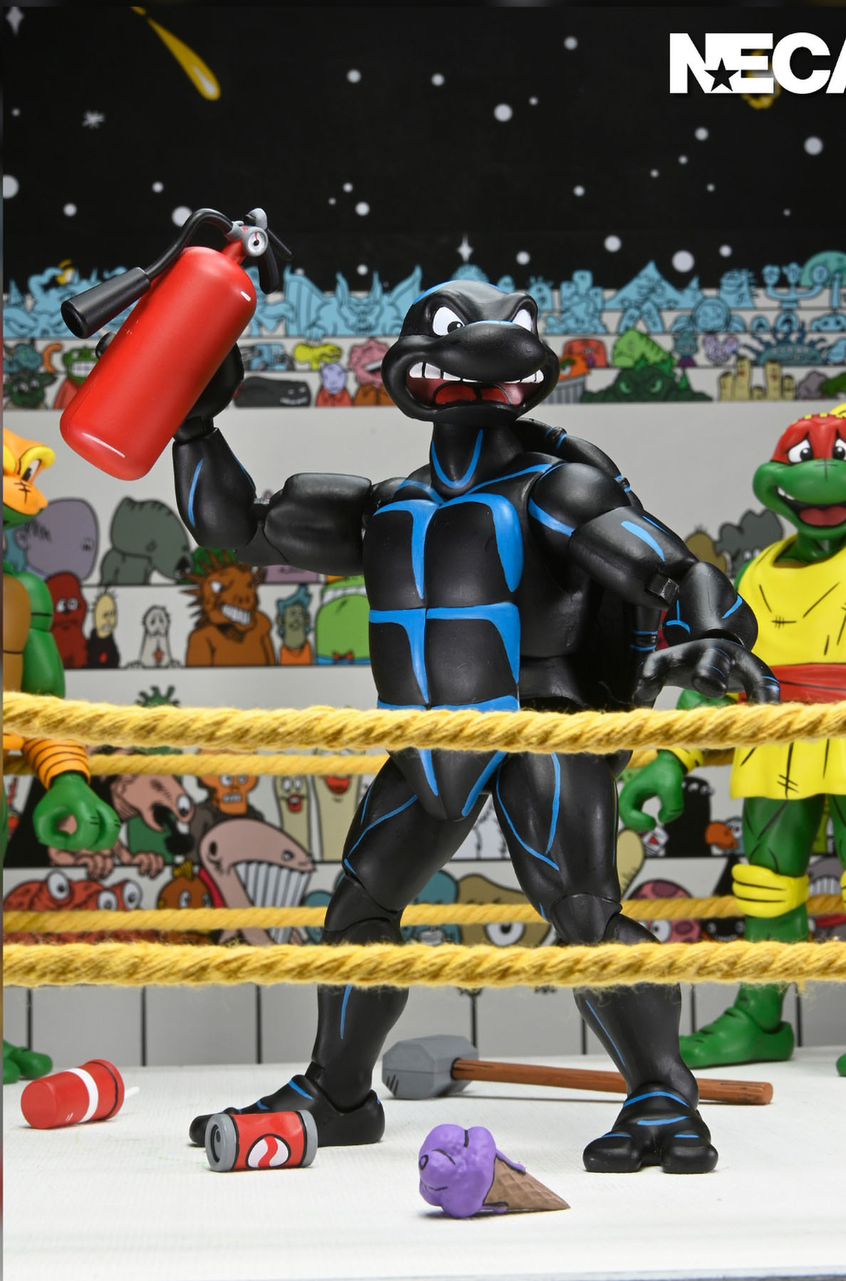 À l’intérieur, les figurines sont comme toujours comprises dans un écrin de plastique transparent. À l’arrière, NECA a glissé une illustration rappelant les gradins remplis de supporters de tous horizons, visibles en page 10 du TMNT (Vol. 1) #7. Toutefois, les personnages ont été redessinés et la frise agrandie pour y inclure plus de personnages, qui seront peut-être, pour certaines, des figurines à venir dans la gamme. Nous pouvons voir Bellybomb, les Fils du silence, Manmoth, T’Pau, Boss Salvage ou encore Wingnut.