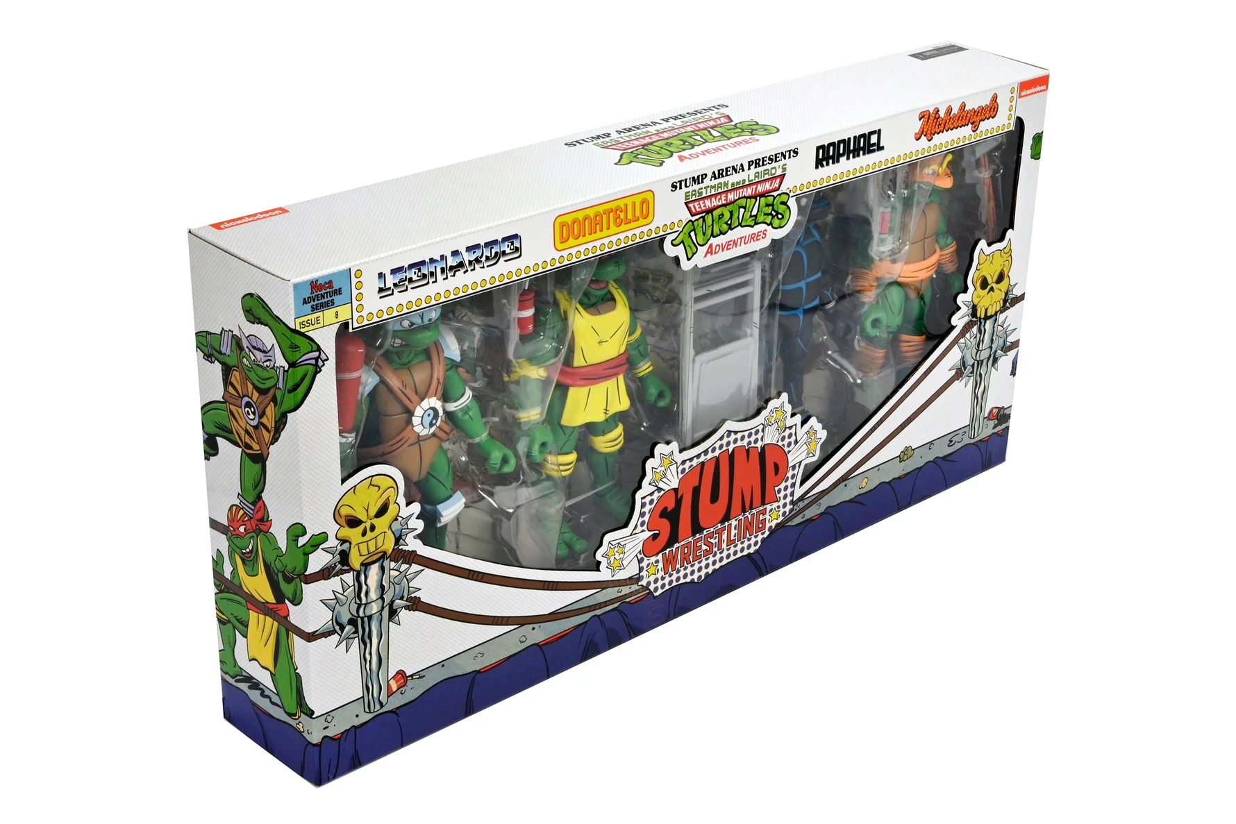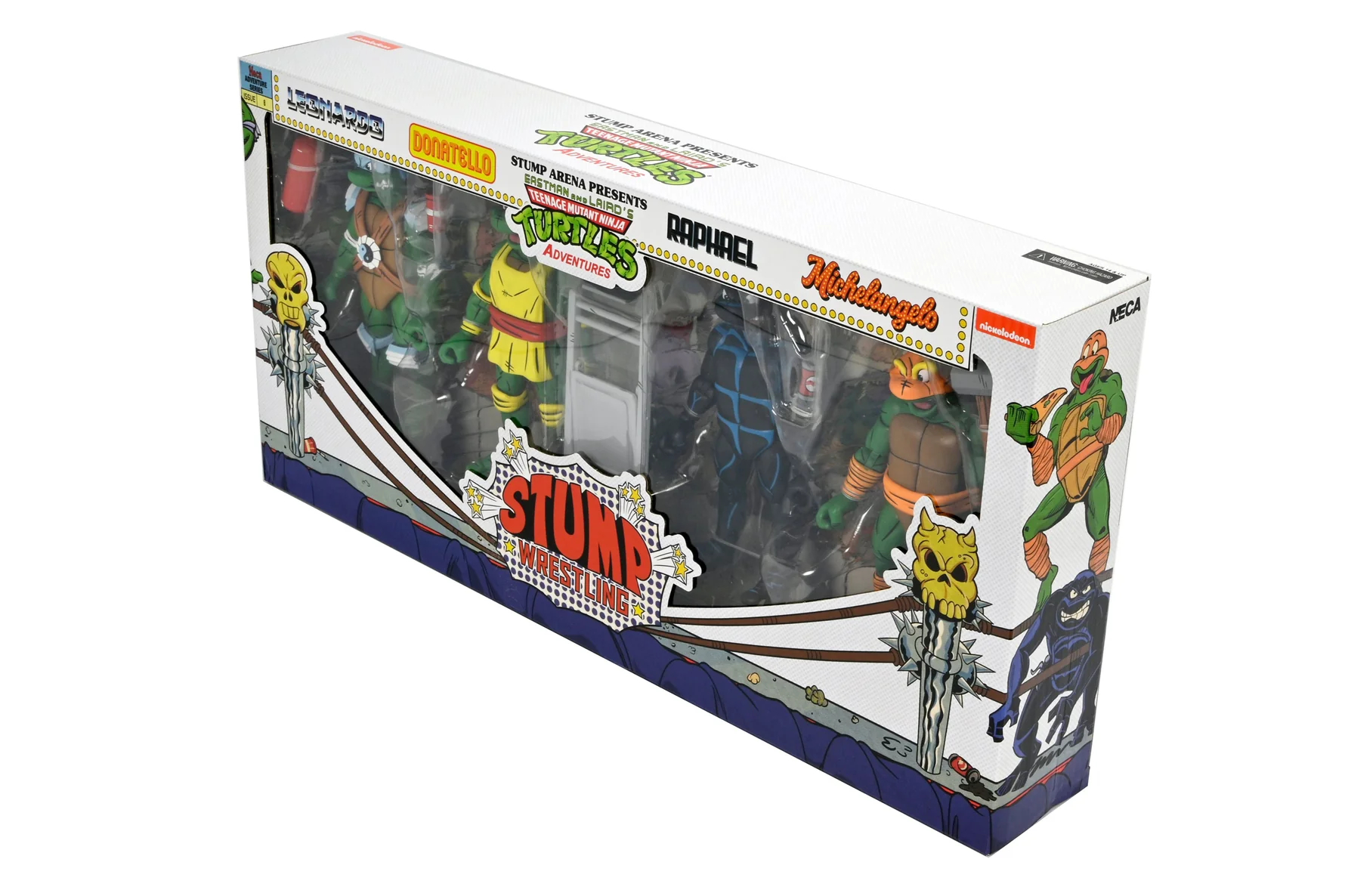 Raphael et les autres tortues en tenues de catch ont été distribuées dans une boîte en carton de taille standard pour un 4-pack. La fenêtre en plastique laisse entrevoir les tortues à l’intérieur. Les illustrations de la boîte sont signées Ken Mitchroney, le dessinateur par excellence des premiers numéros des TMNT Adventures. Les différents décors du ring de catch sont quant à eux assurés par Aaron Hazouri (source). À l’arrière, les photographies de Stephen Mazurek sont présentées dans un décor de moniteur. Celui-ci est inspiré du résumé des évènements précédents par Stump et Sling du TMNT A. #11.