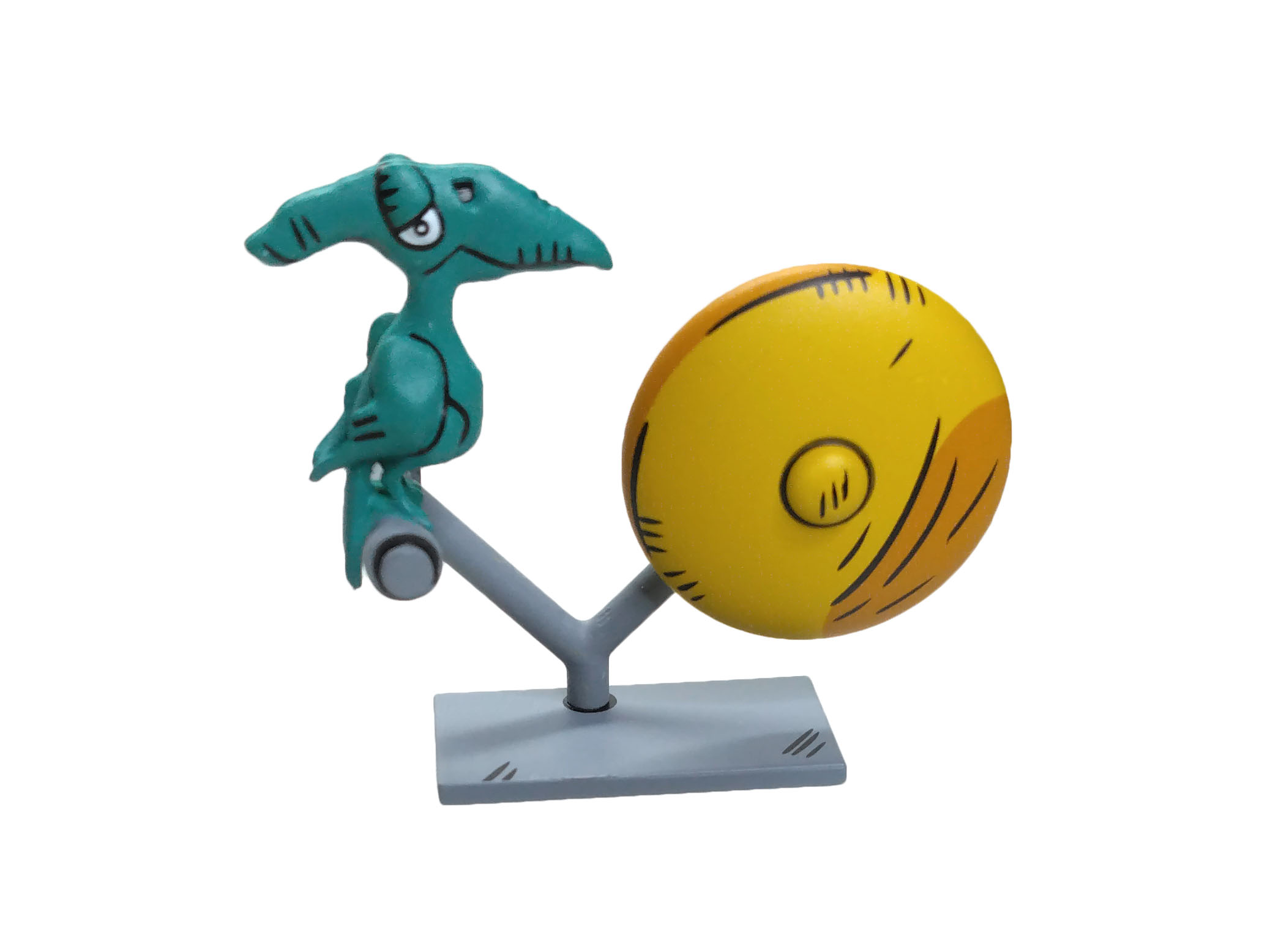 Enfin, le gong de combat ! Visible au moment de lancer les festivités, il est réalisé en plastique rigide. Sauf le ptéranodon et la barre sur laquelle il est posé, qui sont faits en plastique souple collé sur le support rigide. Voilà qui évite une casse inopportune.