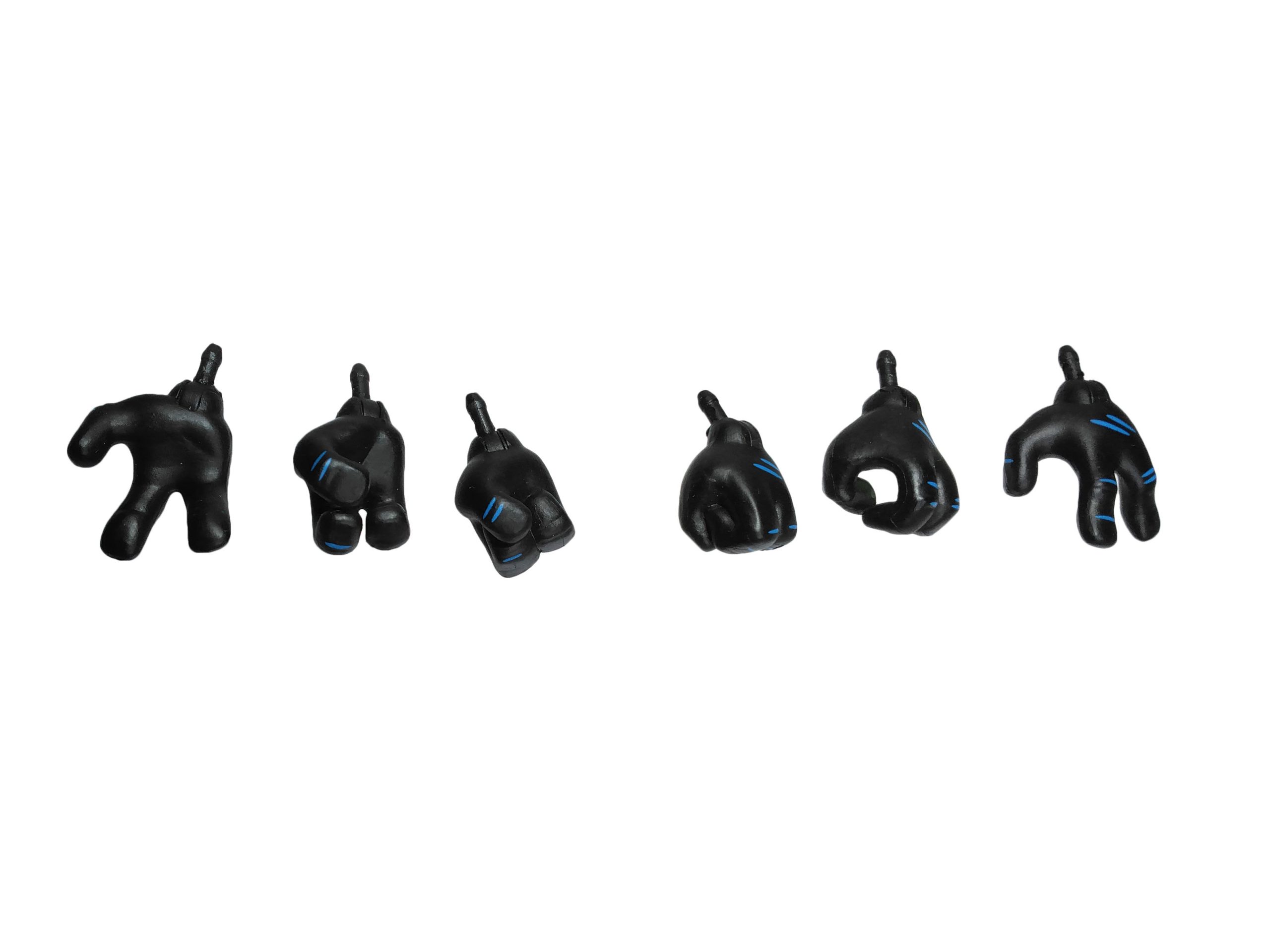 De couleur noire, comme sa combinaison, celles-ci sont différentes des mains proposées pour les autres reptiles. Nous avons une paire aux poings fermés, une permettant de tenir des accessoires (commune à toutes les tortues) et une avec les doigts totalement ouverts. J’ai un immense coup de cœur pour ces nouvelles mains et regrette vraiment qu’elles n’aient pas été adaptées en vert pour les autres tortues. À l’inverse, je regrette également l’absence de certaines mains pour Raphael, comme celle doigts tendus pour saisir un adversaire. Bien entendu, vous pouvez également utiliser les mains vertes des autres frères sur Raphael. On dira qu’il a simplement retiré ses gants !