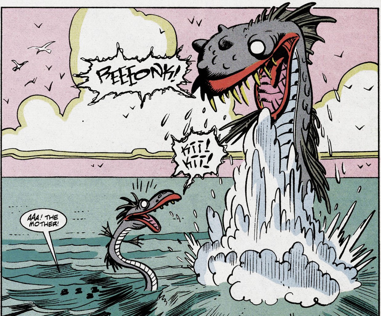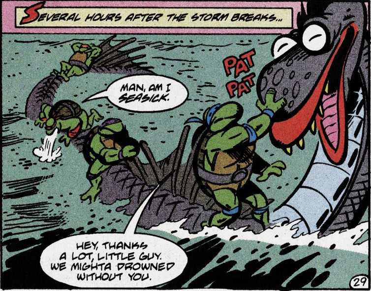 Le serpent de mer était dans le viseur du périscope d’Agamatta, qui appuyait sur la gâchette. Il tenait sa vengeance. Mais le harpon ne s’était pas lancé. Les tortues, qui se trouvaient sur le pont, avaient eu le temps de saboter son lanceur. Umihaha leur faisait face avant de plonger dans l’eau et revenir à la surface, donnant un coup de tête sur le flanc du navire. Les tortues tombaient à l’eau une nouvelle fois. Elles étaient loin du bateau, qui n’avait pas encore coulé. Essayant de le rejoindre, les mutants voyaient un serpent s’avancer vers eux. Il ne s’agissait que d’un petit, qui avait l’air d’être content d’être avec eux. Mais bientôt, Umihaha sortait à son tour de l’eau. Bien conscientes que cette mère voulait surtout protéger ses petits, les tortues cherchaient à entrer en communication avec elle par la pensée, comme elles l’avaient déjà fait avec Splinter (TMNT A. #17).