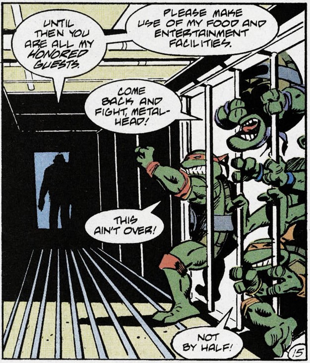 Agamatta retirait sa cape devant ses invités, révélant ses bras de fer et son visage en partie défiguré. Il vouait sa vie depuis de nombreuses années à chasser Umihaha et venait de perdre sa meilleure chance d’atteindre son but. Les tortues devaient retenir une nouvelle fois Leonardo, qui s’énervait de voir un homme favoriser sa vengeance sur le sauvetage de ses frères et de la famille Slujj. Ils étaient les bienvenus ici et allaient pouvoir manger. Agamatta les conduisait à leurs quartiers, très richement décorés. Tous étaient conquis, mais soudain une griller se fermait à l’entrée de la pièce. Le capitaine les laisserait sortir une fois sa mission accomplie. Il n’était pas question de se détourner de son objectif.