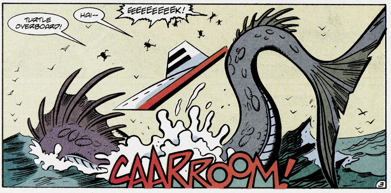 Peu après son aventure en forêt du nord-ouest des États-Unis (If a tree falls), Shelton Slujj avait décidé d’inviter ses nouveaux amis en croisière sur son yacht. Seules les tortues étaient présentes ; Splinter préférait repartir dans les égouts et April devait reprendre le travail. C’était Percy Brice qui faisait tourner son entreprise, en son absence. La dérive dans l’Océan Pacifique ne déplaisait pas aux tortues, qui prenaient du bon temps.Soudain, quelque chose sortait de l’eau et frappait le bateau. Une forme gigantesque, écailleuse plongeait immédiatement dans les profondeurs. Tous tombaient à l’eau. Raphael se rattrapait de son saï sur le dos de la créature, un serpent de mer. Ses frères lui demandaient de venir les aider à sauver Shelton et sa fille Emelia, qui ne savaient pas nager. Il se rapprochait d’eux à l’aide d’un bateau de sauvetage auto-gonflable.