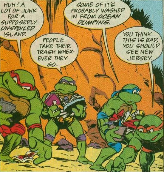 Le lendemain matin, les tortues prenaient du bon temps sur la plage de l’île. Leonardo suggérait à ses frères de nettoyer les déchets qu’ils avaient laissés de leurs dernières soirées, et d’en profiter pour ramasser tous les détritus qui jonchaient le sable.