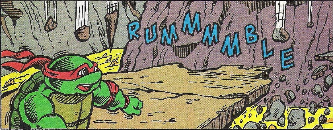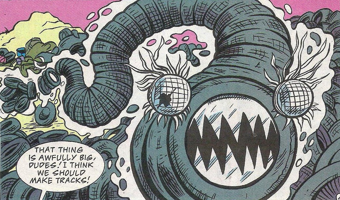 L’énigme était terriblement vague pour les tortues. Elles visitaient les lieux en espérant trouver une réponse, entendant les moqueries de la sorcière dans leur dos. Raphael ne put s’empêcher de tenter le tout pour le tout et envoyer un saï en direction de la sorcière, qui l’évitait d’un geste vif avant de s’évaporer. Mais elle ne tenait pas à les quitter sans leur laisser un petit souvenir : un serpent composé de vieux pneus et des crocs de métal acérés. Les tortues devaient se séparer et faire face à de nombreux robots qui prenaient vie à travers les tonnes d’ordures amassées.
