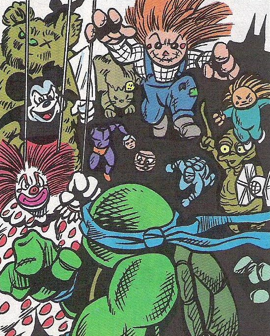 Parmi les jouets que combattent les tortues, on peut voir une peluche de Mikey Mouse, de E.T. l’extraterrestre et un Tie fighter de Star Wars.