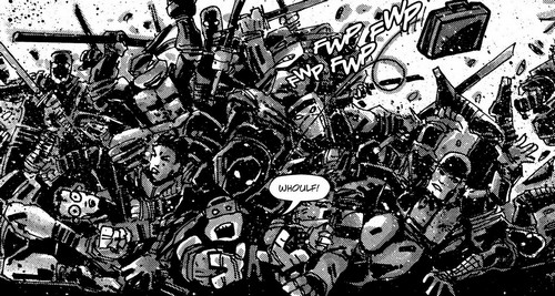 L’alerte avait été donnée aux forces de l’ordre. Les docks étaient en proie à un conflit mettant en scène plusieurs dizaines de personnes. Le S.W.A.T. était en route. Karai réclamait à Victor la mallette contenant ce qui leur était dû. Casey s’emparait de l’objet de toutes les convoitises après une dispute avec un ninja Foot. Finalement, tous se ruèrent dessus espérant pouvoir la garder. Dans le désordre de la bataille, Casey finit par la récupérer avant de la jeter dans l’East River. Son contenu se déversait dans l’eau. Il était perdu à jamais. Victor et Karai, consternés, étaient interrompus par le S.W.A.T. qui venait d’arriver. Toutes les factions s’empressaient de disparaître.