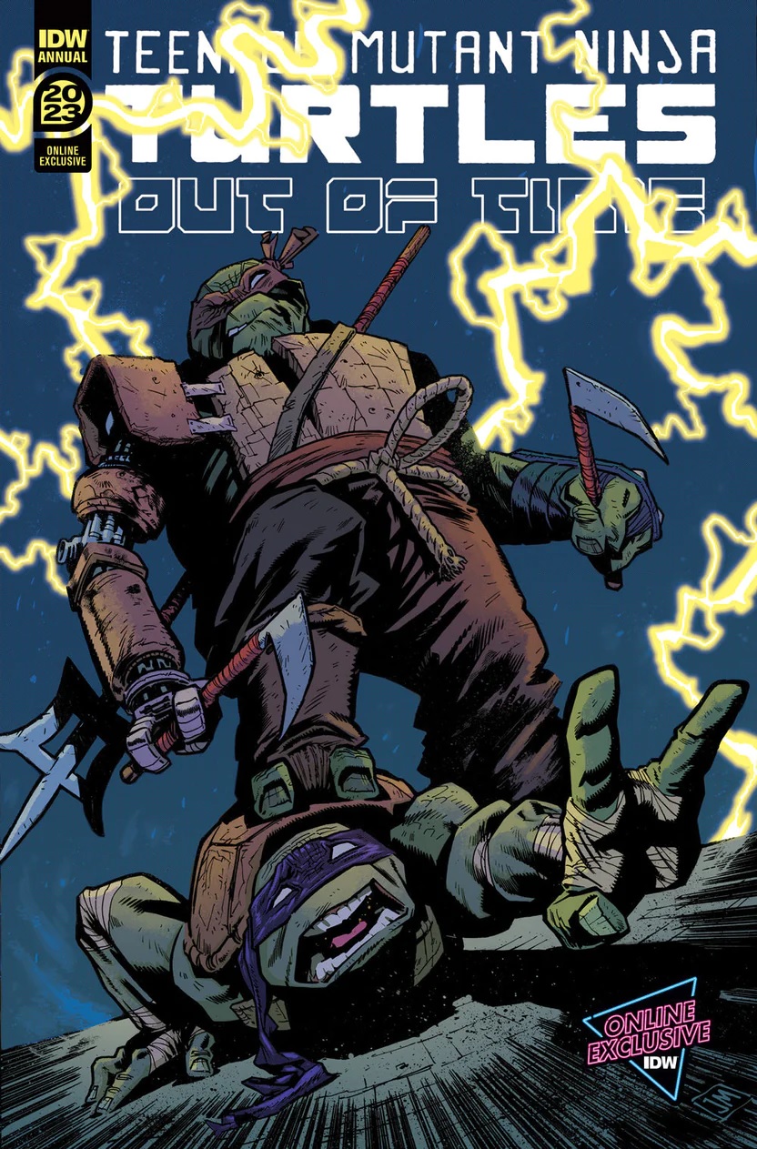 Une tortue, d’apparence très âgée, traversait les couloirs du temps, lorsque soudain, l’impensable se produisit. Le couloir était détruit, broyé par la puissante mâchoire d’un requin géant. Dans sa destruction, le mutant perdait un bras. Il se retrouvait plongé dans l’espace, face à une multitude de Terres qui s’entrechoquaient et explosaient. Face à lui se trouvait une impressionnante machine. Une autre tortue était à son bord. Puis un éclair survint. La tortue blessée avait disparue.