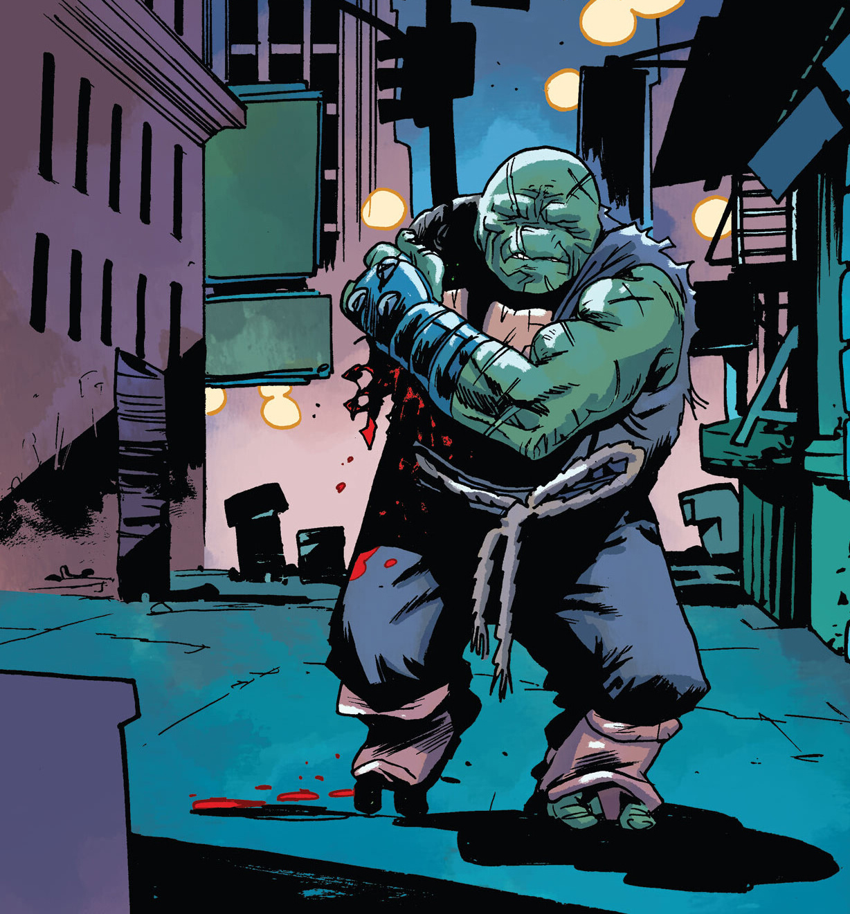 Des éclairs apportaient un petit peu de lueur au fond d’une ruelle plongée dans l’obscurité. La tortue vieillissante apparaissait. Sa blessure le faisait tituber. Mais ce qu’elle voyait lui faisait très vite oublier la perte de son bras. Le mutant était retourné chez lui, à New York.