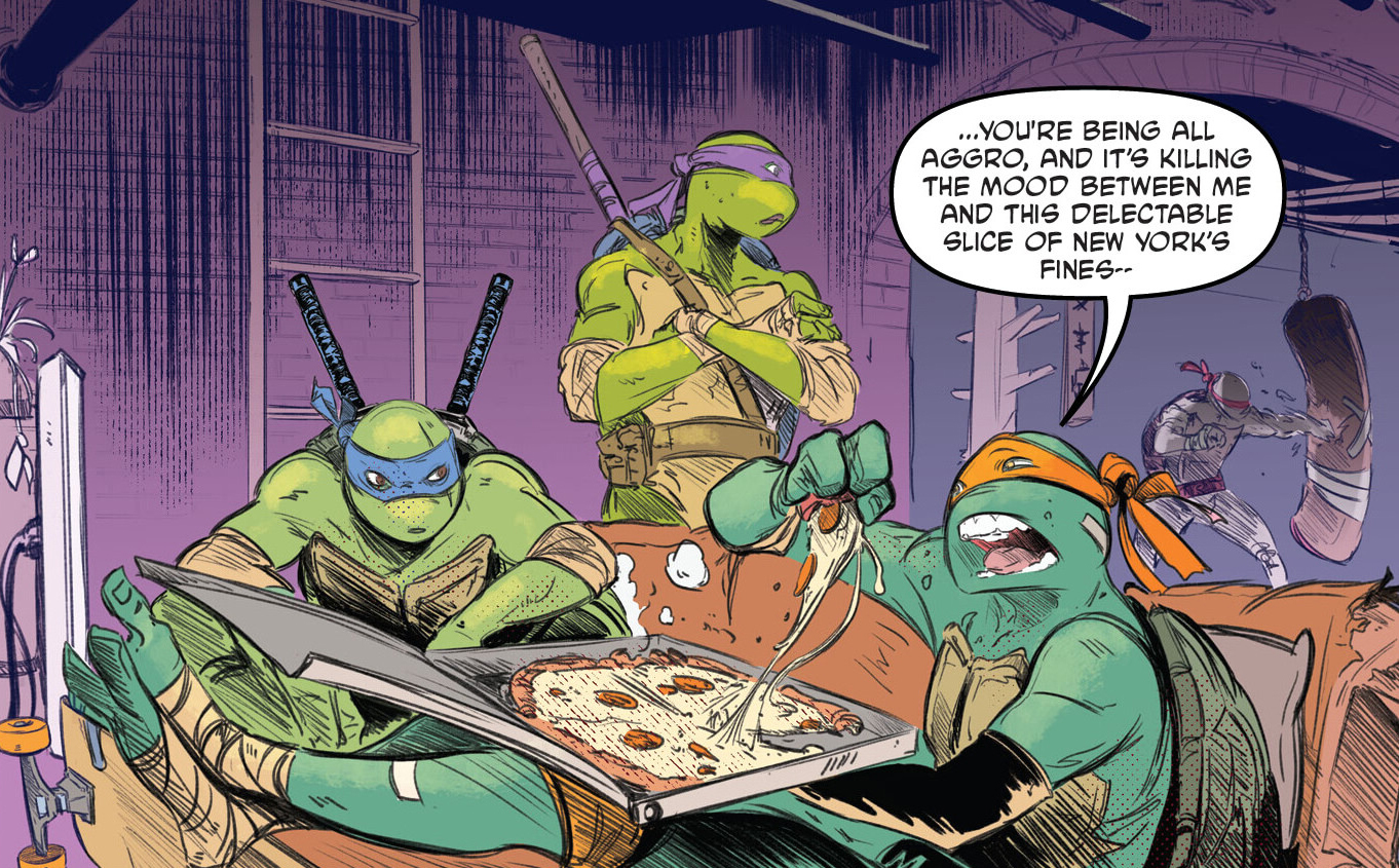 Dans les égouts, Michelangelo avait convié ses trois frères à déguster une bonne pizza et se retrouver comme au bon vieux temps. Après ce qu’ils avaient traversés, notamment l’Armageddon Game, il pensait que cela leur ferait plus grand bien. Raphael n’était pas de cet avis. La tortue massacrait un sac de punching-ball, pensant à tout ce qu’ils avaient perdu. Alopex pour lui. Le Rat King ou encore Splinter pour les siens. Il avait surtout envie de se défouler. Ses coups, de plus en plus intenses, finissaient par avoir raison du sac d’entraînement, qui se déchirait. Il ne semblait pas comprendre que Michelangelo avait besoin de se retrouver au calme auprès de ses frères après toutes ces épreuves.