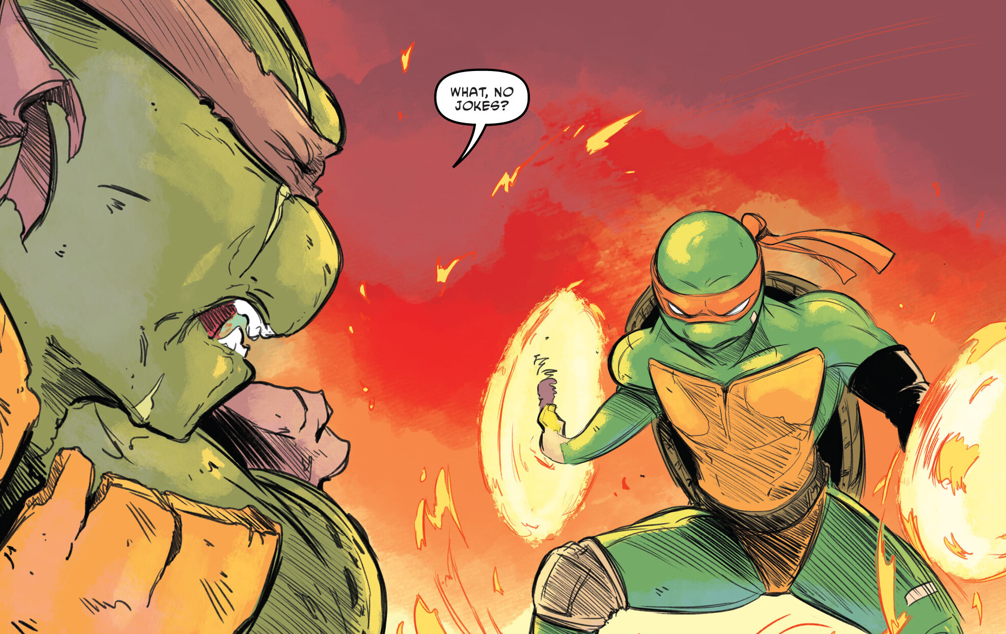 Les quatre frères avaient pris soin du reptile blessé. Donatello lui avait greffé un bras de fortune, issu d’une ancienne version de Metalhead sur laquelle il avait jadis travaillé. Le petit génie de l’équipe avait également procédé à quelques tests, pensant que le mutant était une autre victime de la bombe de Old Hob (TMNT #98). Il n’en était rien. La tortue était parvenue à la conclusion que l’inconnu avait été transformé il y avait plus de 60 ans !