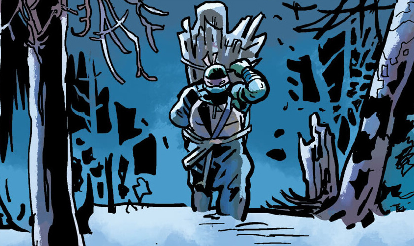 Raphael s’en était allé dans les bois, vivre à l’écart de la ville. Un soir, alors qu’il ramassait du bois, il entendit un bruit. S’apprêtant à se battre, il vit une nuée de ninjas lui sauter dessus. Ils étaient trop nombreux, il se fit dépasser.