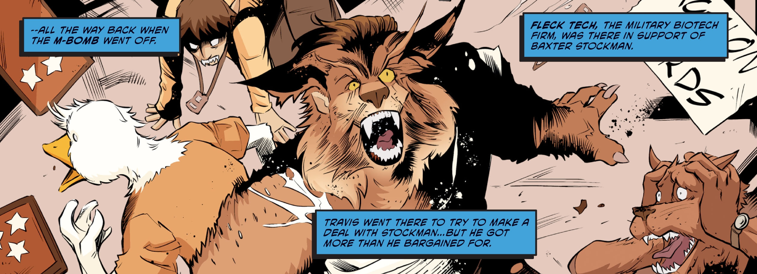 Ce groupe militant n’avait pas de nom. Mais en faisant ses recherches, Leonardo avait découvert qu’ils vendaient des armes à Mutant Town et dans l’ensemble des États-Unis. Ces hommes étaient assoiffés de sang et la tortue craignait le pire pour Travis. Le prisonnier avait été changé en lynx mutant lors de l’explosion de la bombe de mutagène d’Old Hob (TMNT (Vol. 5) #98). Il s’était rendu au meeting de Stockman pour lui proposer un accord. La famille étant très soudée, ses trois frères avaient veillés à l’exfiltrer de Mutant Town en contactant des mercenaires.