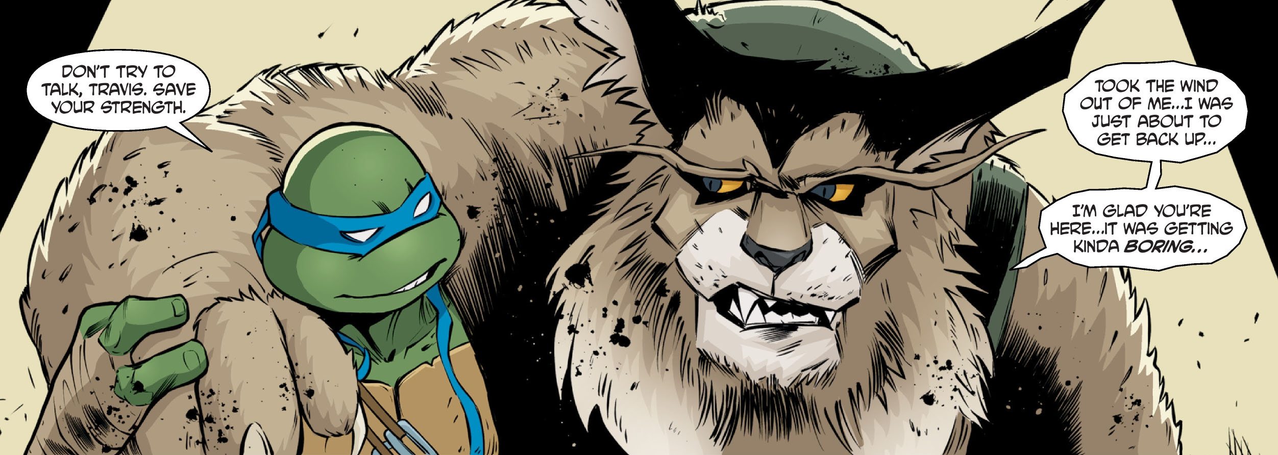 Les mois suivants furent très difficiles pour Travis Fleck, qui n’était plus respecté de personne dans son entreprise et fut même attaqué lors d’une conférence de presse. Les quatre frères se réfugièrent dans leur penthouse pour tenter de remonter le moral au mutant. En vain. Les trois humains furent assassinés. Travis avait disparu. L’appartement était sens dessus dessous, un combat avait dû éclater. Il s’agissait d’une histoire qui avait prise Leonardo aux tripes, repensant à ses propres frères et aux moments passés ensemble.