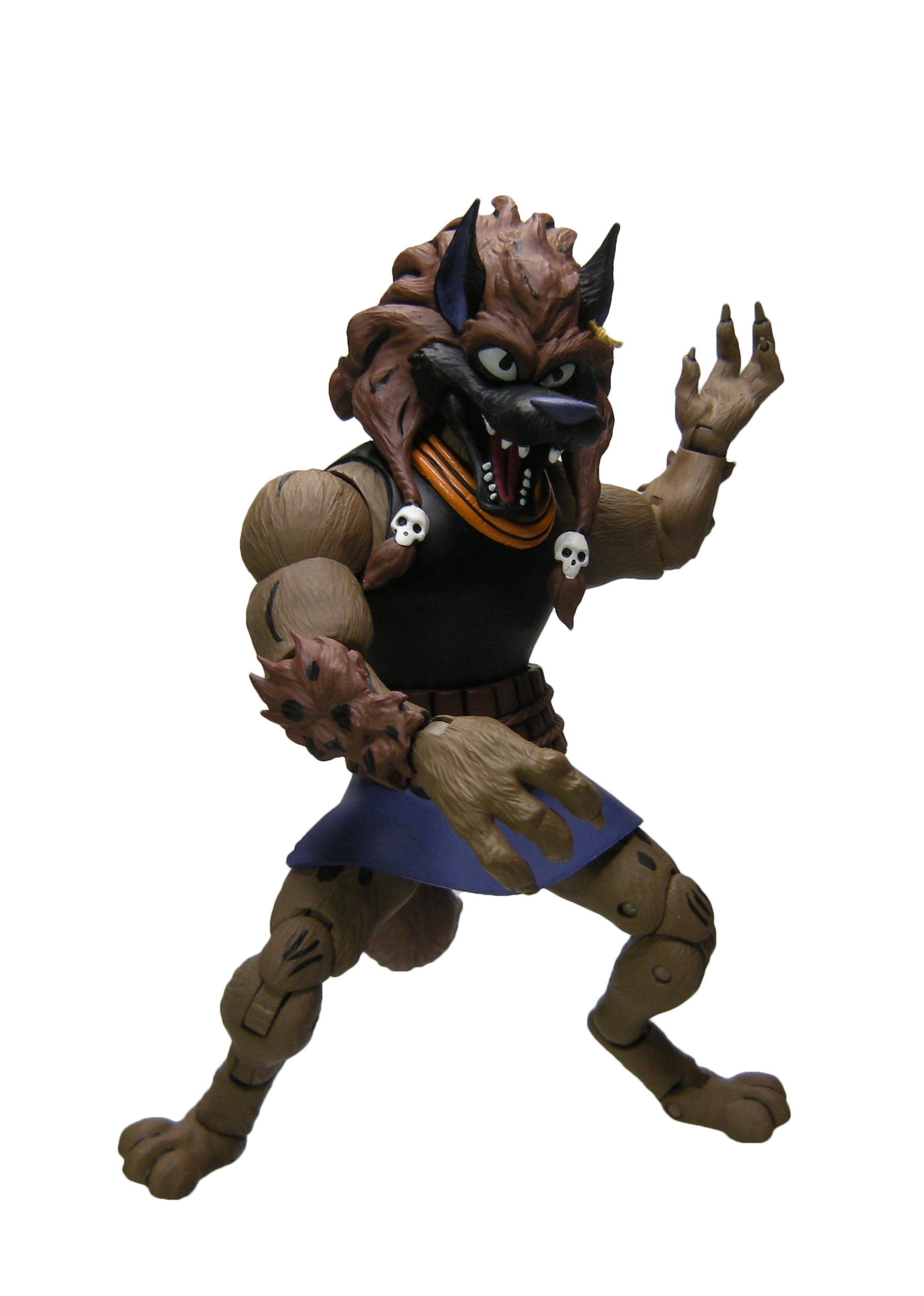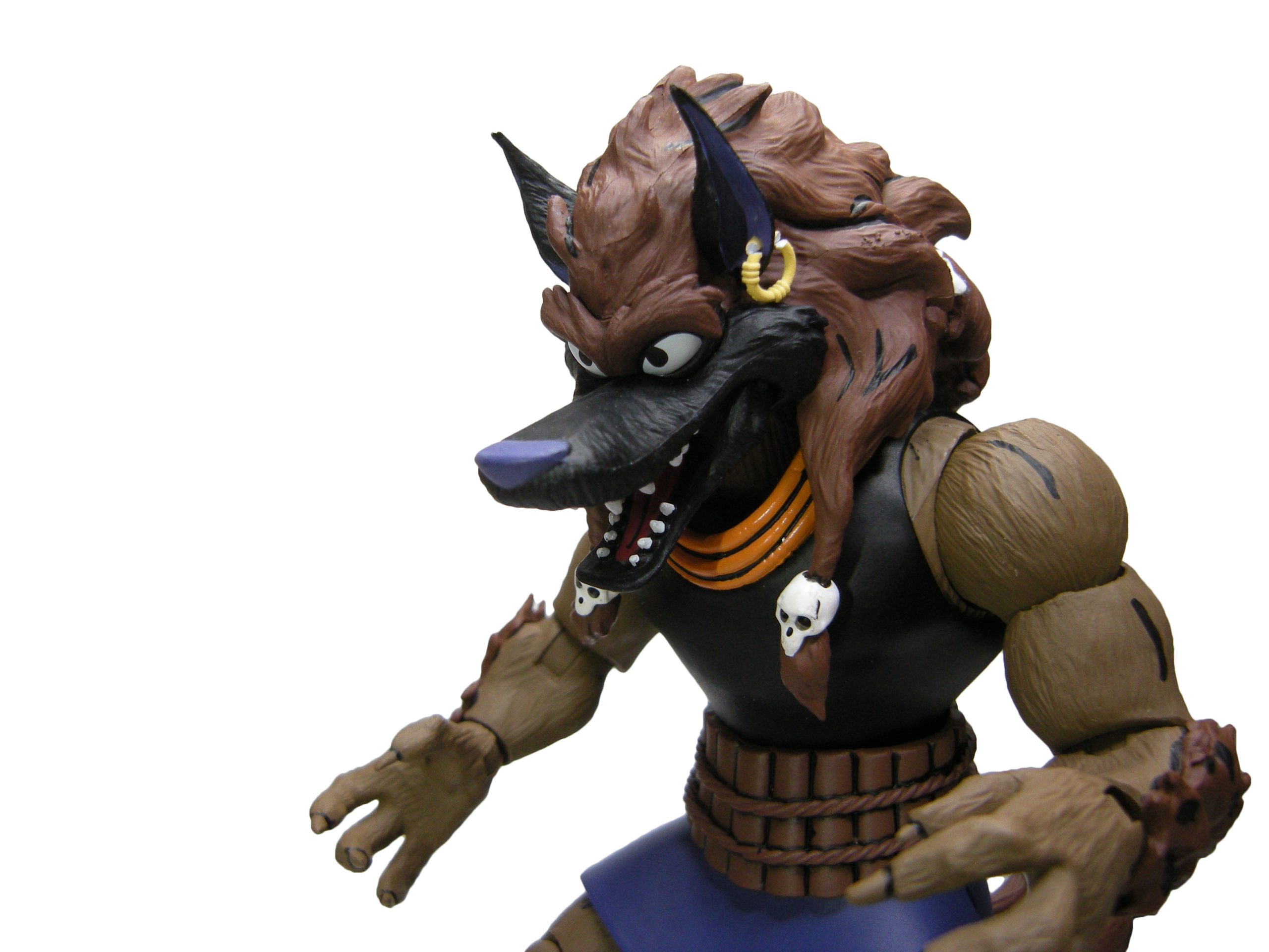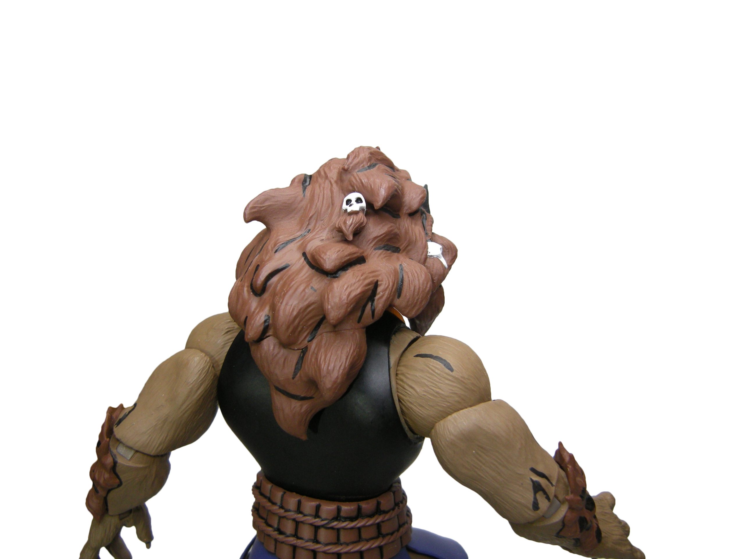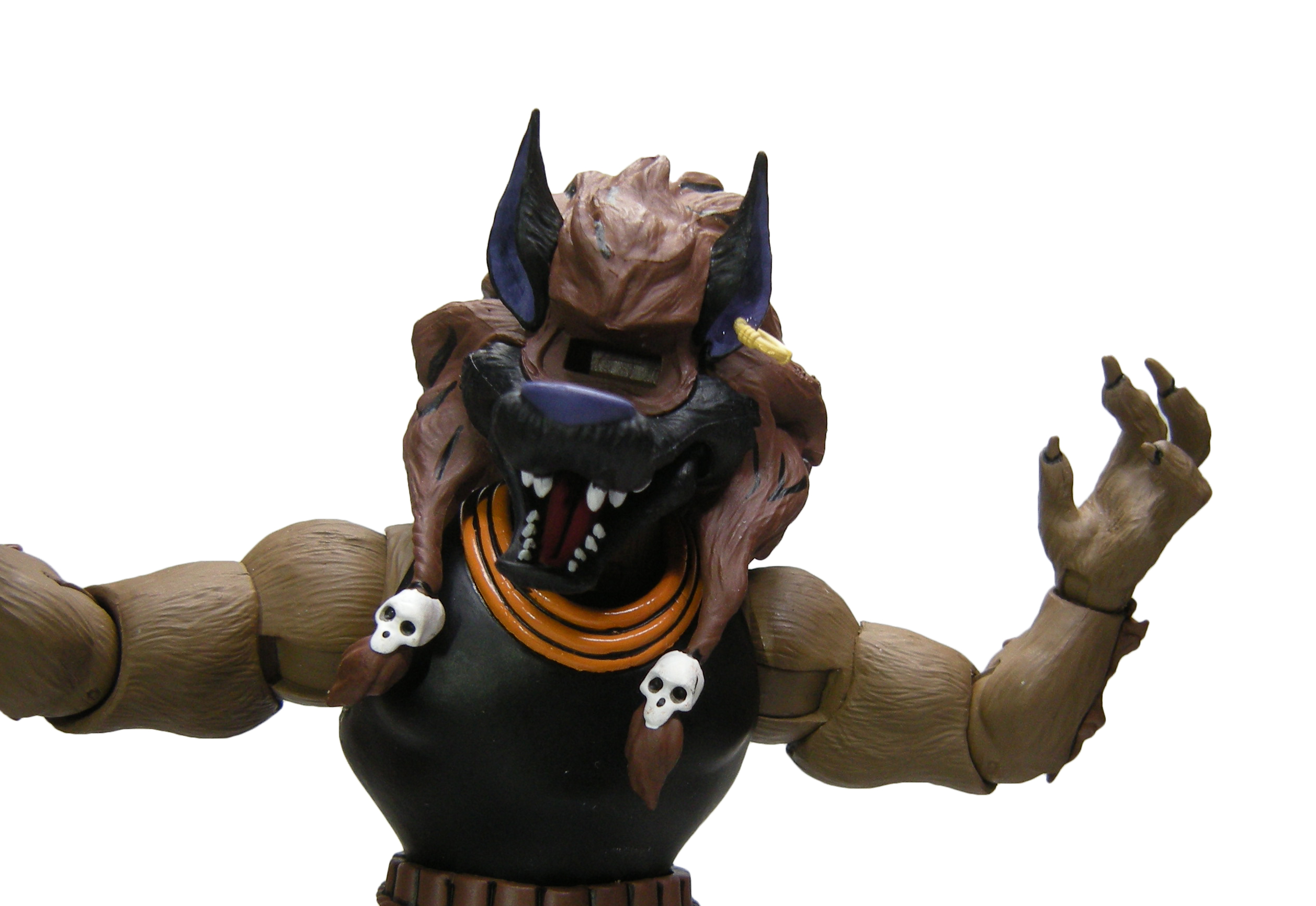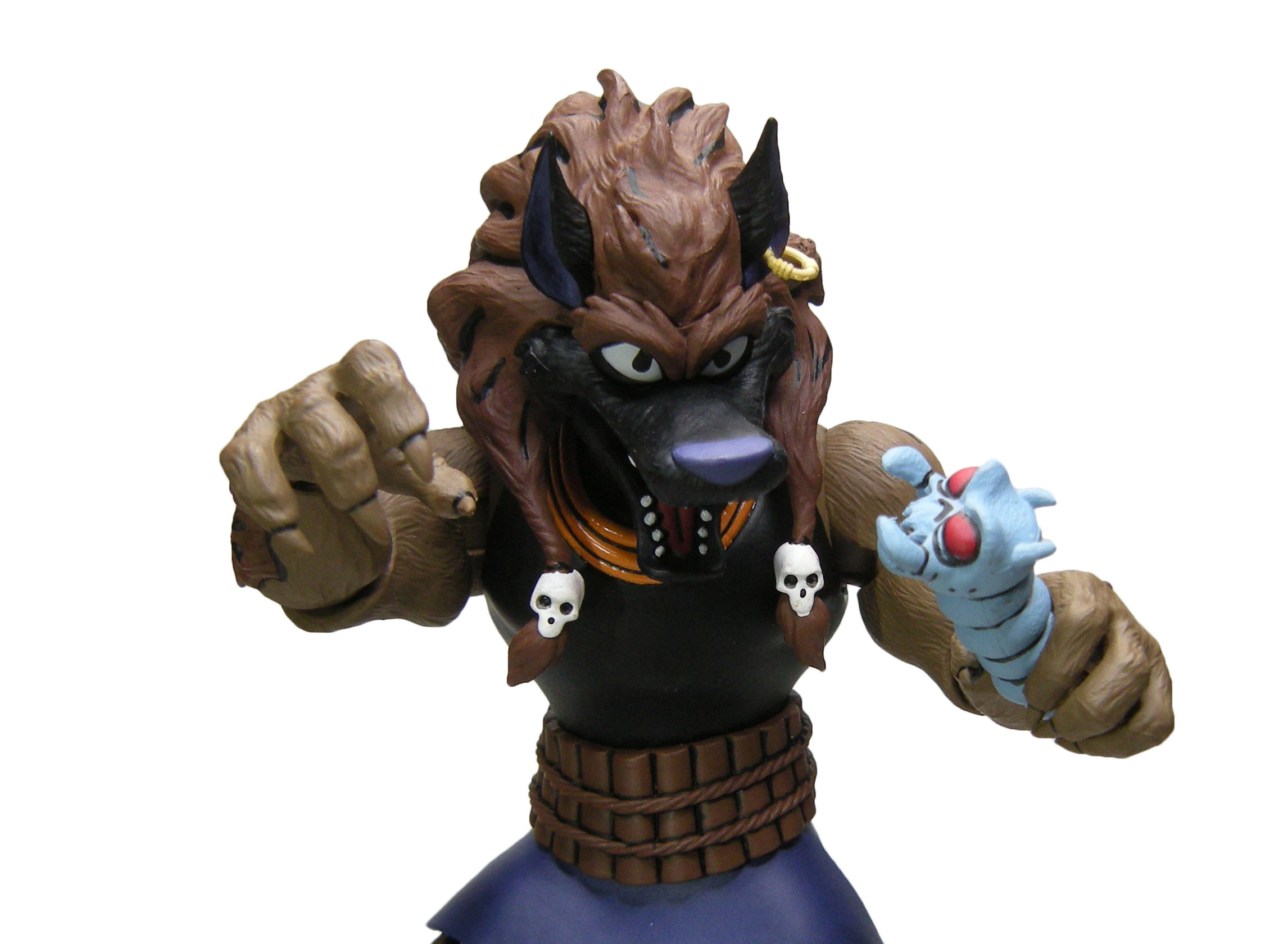 Le corps du mutant est très simpliste, en dehors de la tête. Il porte une sorte de jupe et un débardeur, tous les deux très lisses. Ses membres sont sculptés de manière à imiter les poils du personnage. Le visage est très bien sculpté, reprenant les traits cartoonesques donnés par Ken Mitchroney. Le regard du loup y joue beaucoup ! Sa très longue tignasse est un bloc de plastique dans lequel nous retrouvons les têtes de mort servant de perles pour nouer ses cheveux. Attention à la boucle d’oreille, extrêmement fragile car très fine ! Celle de mon exemplaire s’est cassée lors des photos de la review.