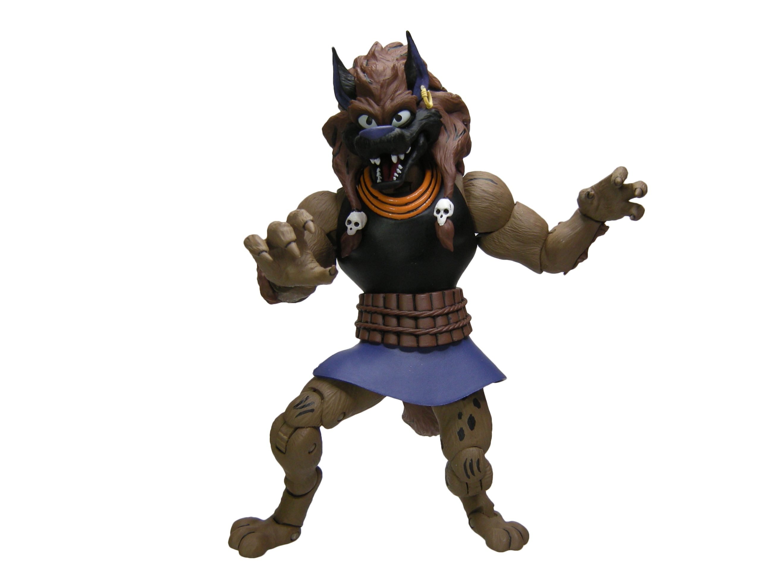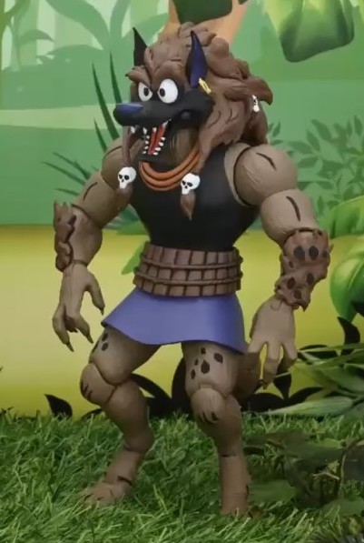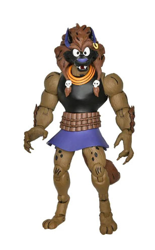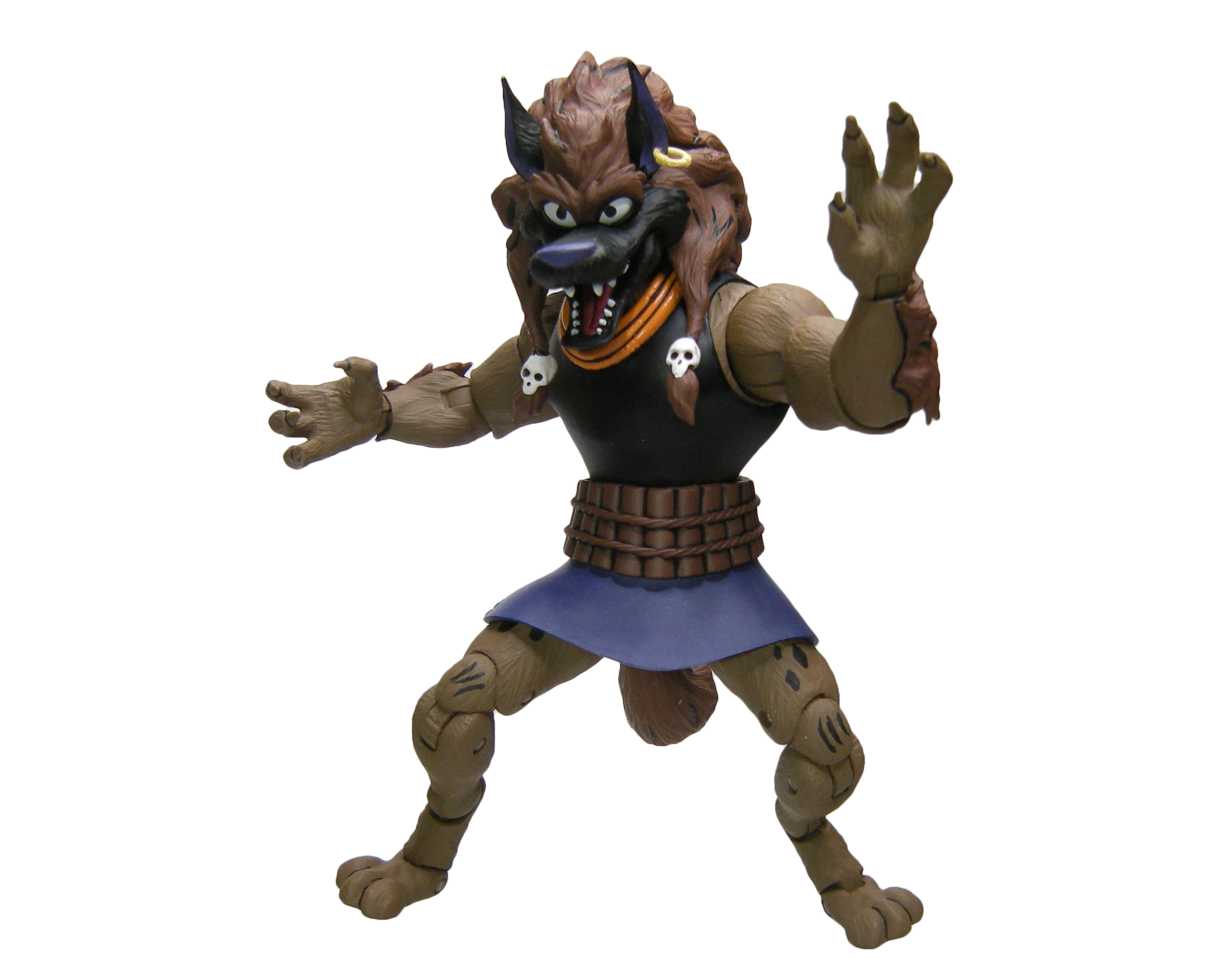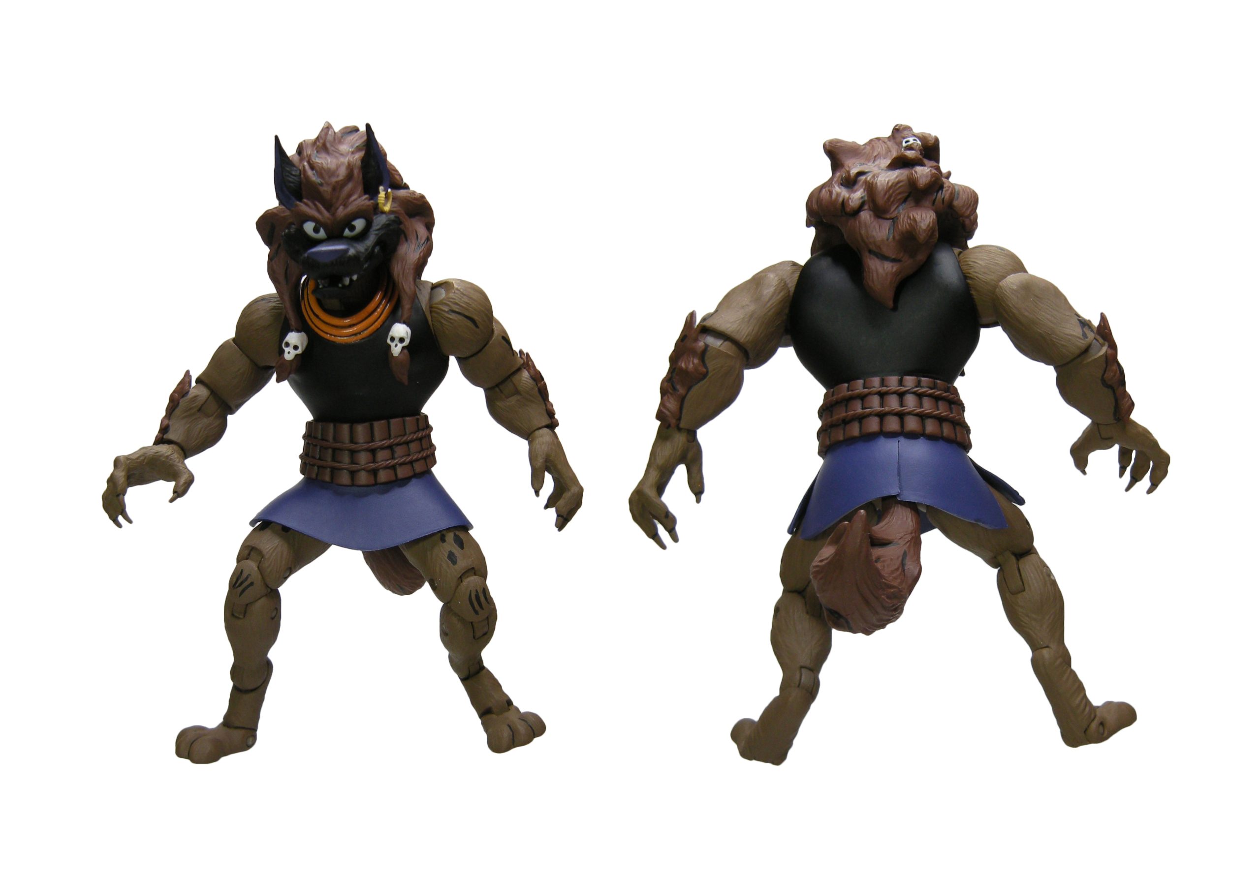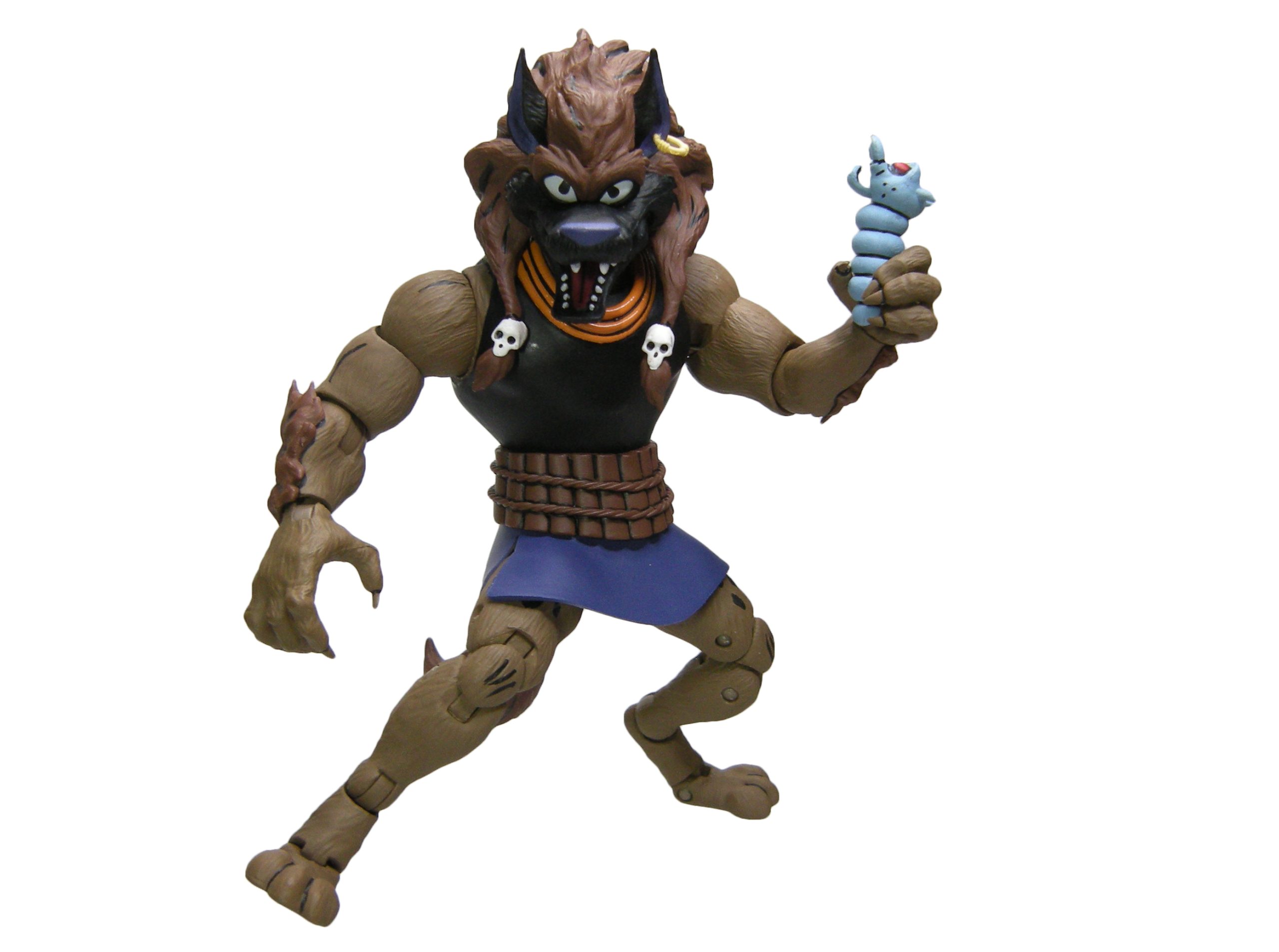 Le corps du mutant est très simpliste, en dehors de la tête. Il porte une sorte de jupe et un débardeur, tous les deux très lisses. Ses membres sont sculptés de manière à imiter les poils du personnage. Le visage est très bien sculpté, reprenant les traits cartoonesques donnés par Ken Mitchroney. Le regard du loup y joue beaucoup ! Sa très longue tignasse est un bloc de plastique dans lequel nous retrouvons les têtes de mort servant de perles pour nouer ses cheveux. Attention à la boucle d’oreille, extrêmement fragile car très fine ! Celle de mon exemplaire s’est cassée lors des photos de la review.