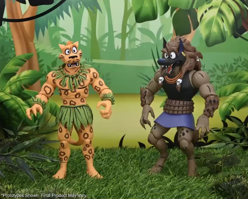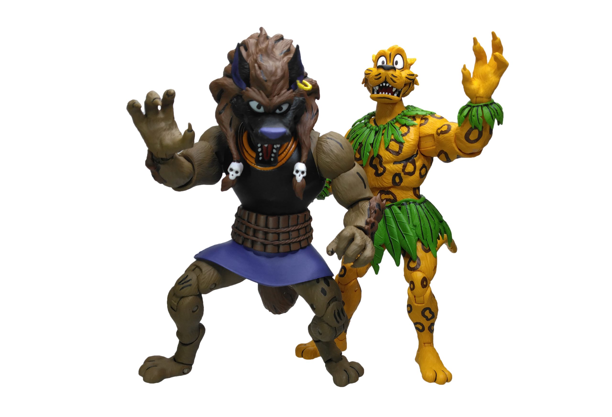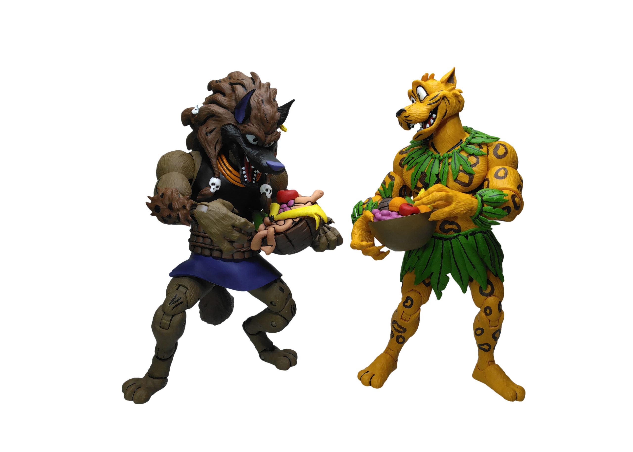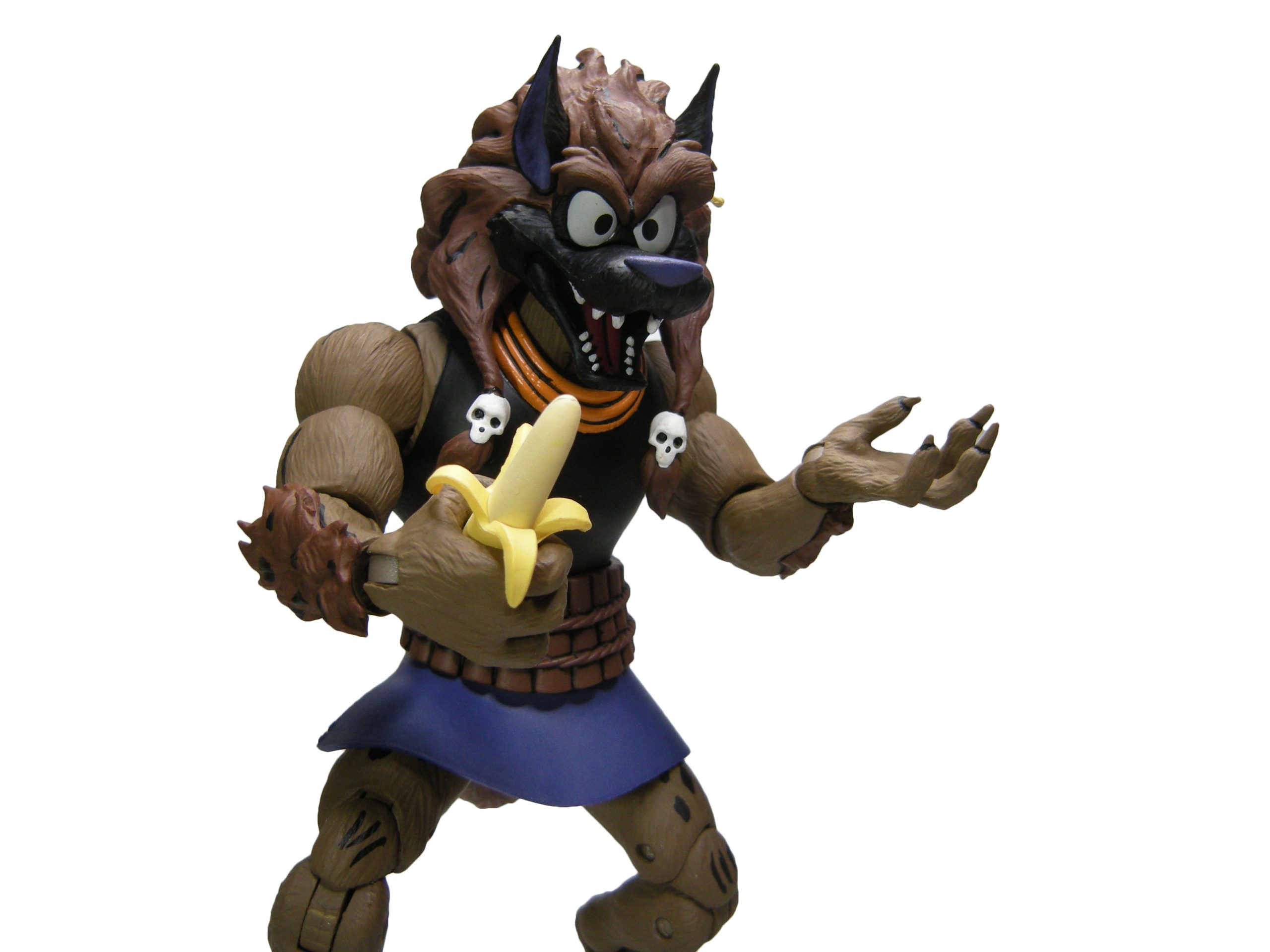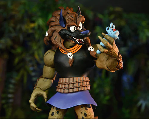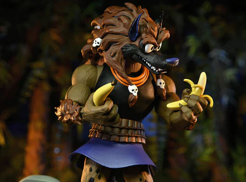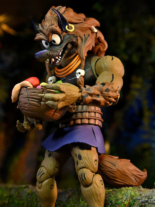 Le corps du mutant est très simpliste, en dehors de la tête. Il porte une sorte de jupe et un débardeur, tous les deux très lisses. Ses membres sont sculptés de manière à imiter les poils du personnage. Le visage est très bien sculpté, reprenant les traits cartoonesques donnés par Ken Mitchroney. Le regard du loup y joue beaucoup ! Sa très longue tignasse est un bloc de plastique dans lequel nous retrouvons les têtes de mort servant de perles pour nouer ses cheveux. Attention à la boucle d’oreille, extrêmement fragile car très fine ! Celle de mon exemplaire s’est cassée lors des photos de la review.