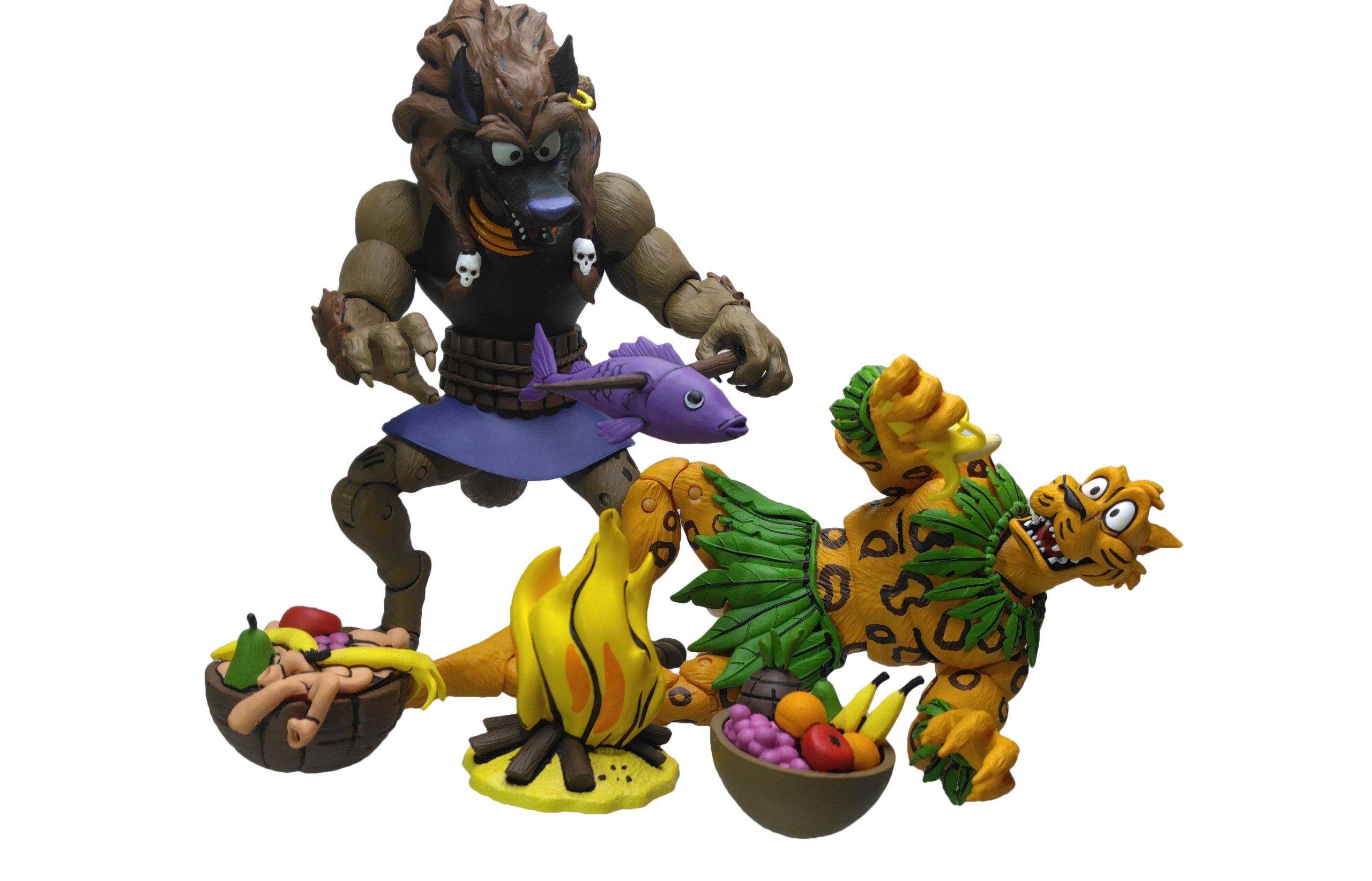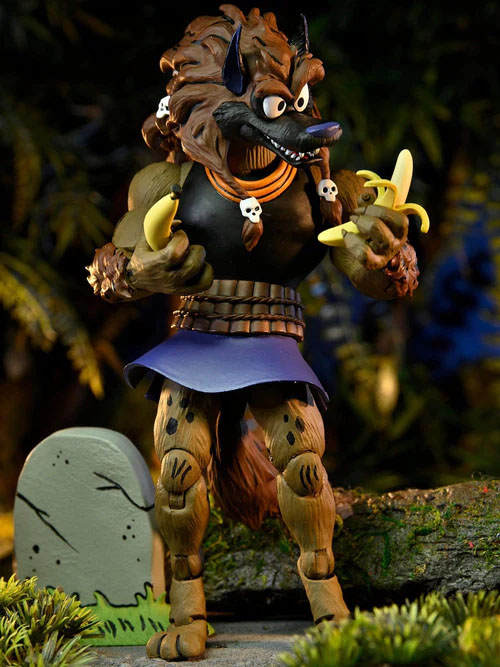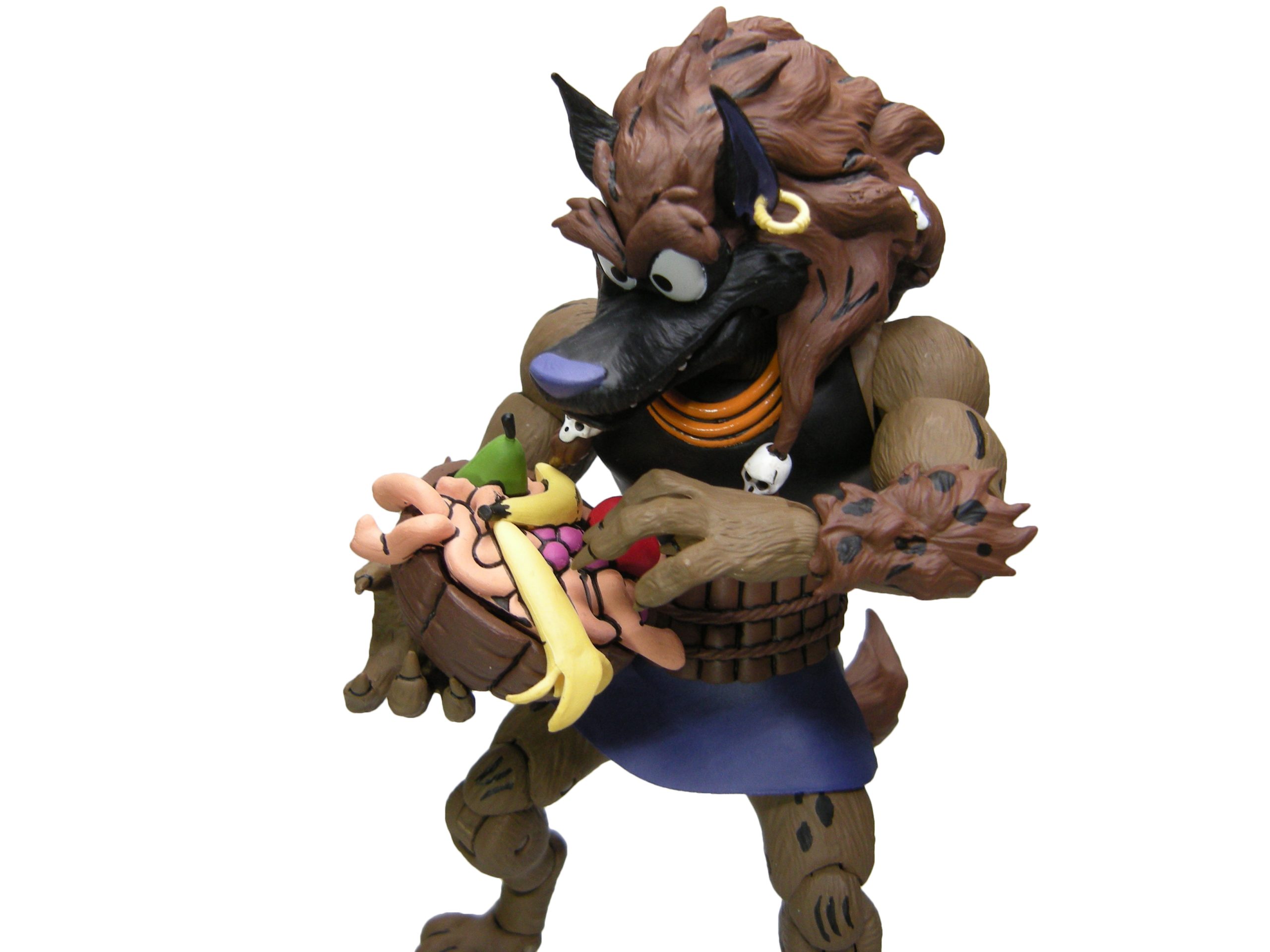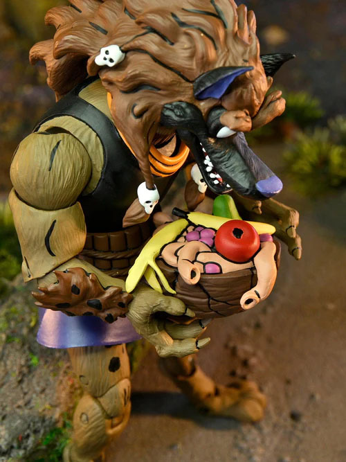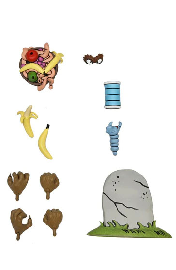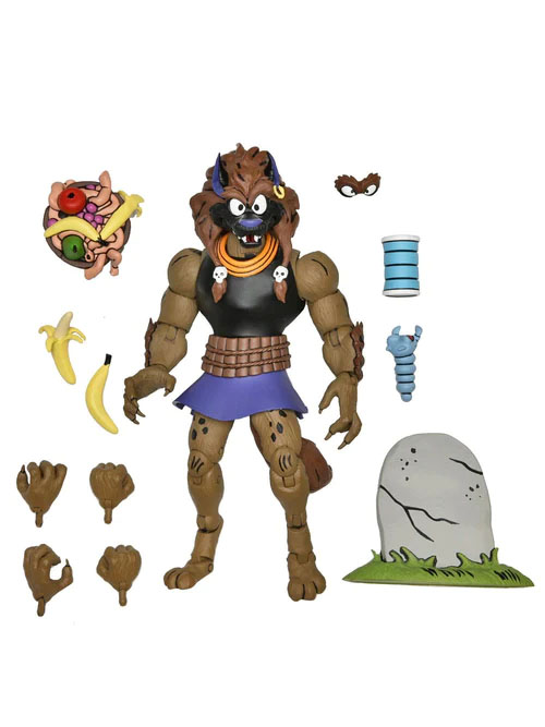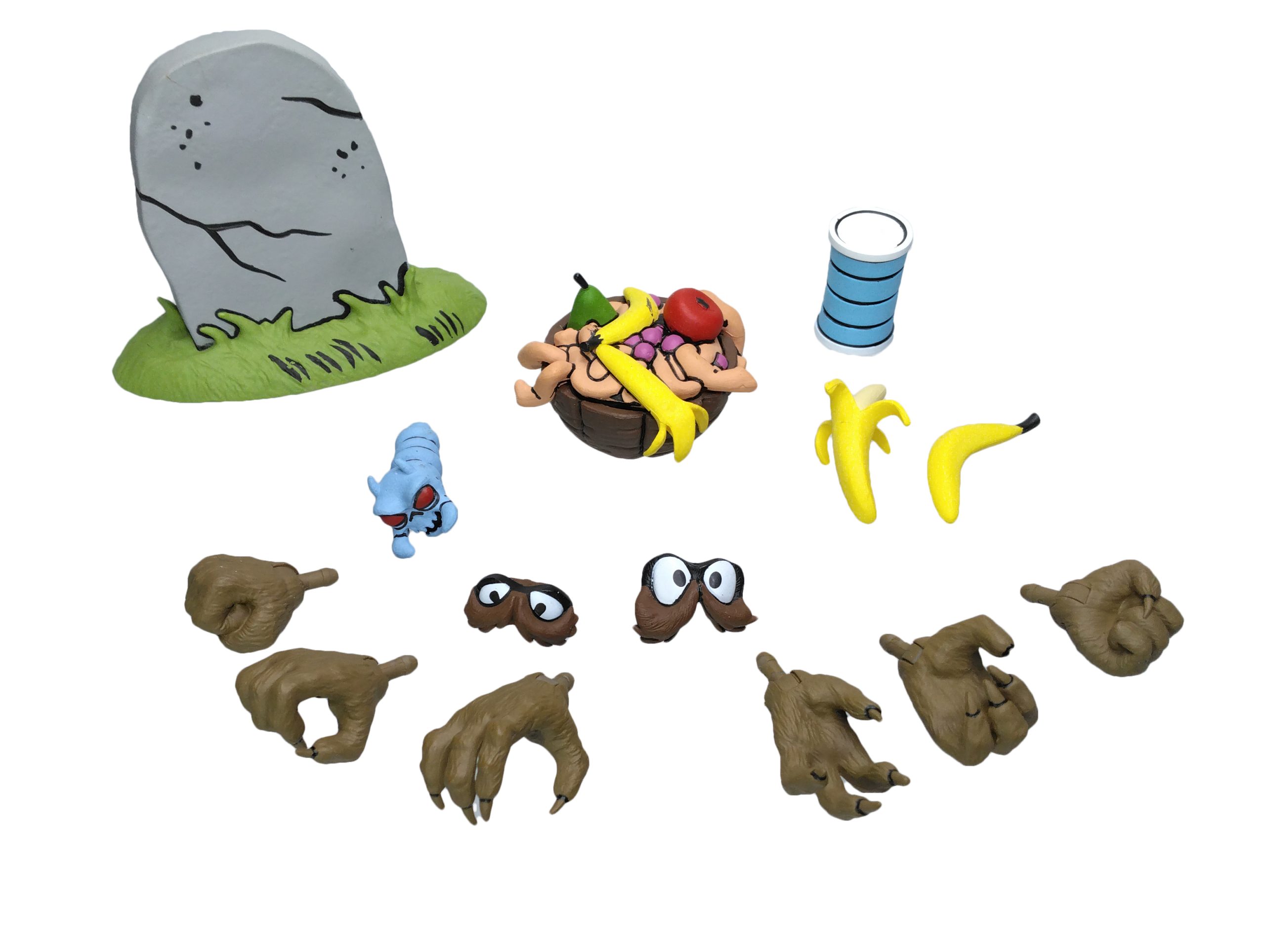 Notre loup champion de la vitesse est accompagné de plusieurs accessoires provenant de ses différentes apparitions. Trois paires de mains interchangeables, une pierre tombale, un bol de tripes de singes et de fruits, une banane intacte et une épluchée, une conserve et un bébé malignoïd sont au programme !