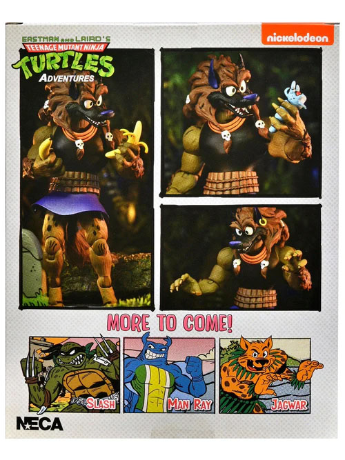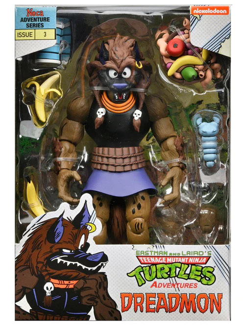 Nous retrouvons, à l’angle supérieur gauche de l’avant du blister, un petit timbre rappelant la numérotation des TMNT Adventures d’Archie Comics. Dreadmon est la troisième figurine de la collection, raison pour laquelle elle arbore un « 3 » à cet endroit. Toutes les illustrations de la boîte sont assurées par l’artiste Ken Mitchroney, qui a réalisé la majeure partie des premiers numéros de ce comic, entre les TMNT A. #5 (l’arrivée de Man Ray) et le TMNT A. #18. Il en réalisa quelques autres par la suite.