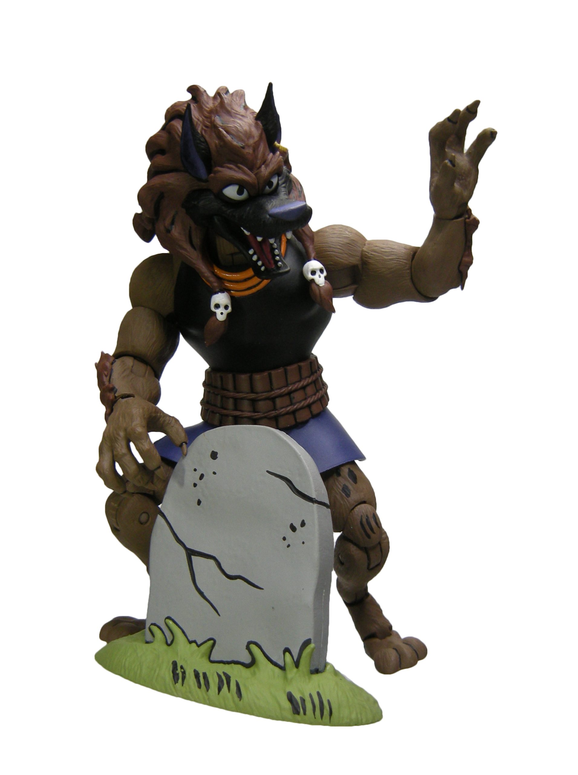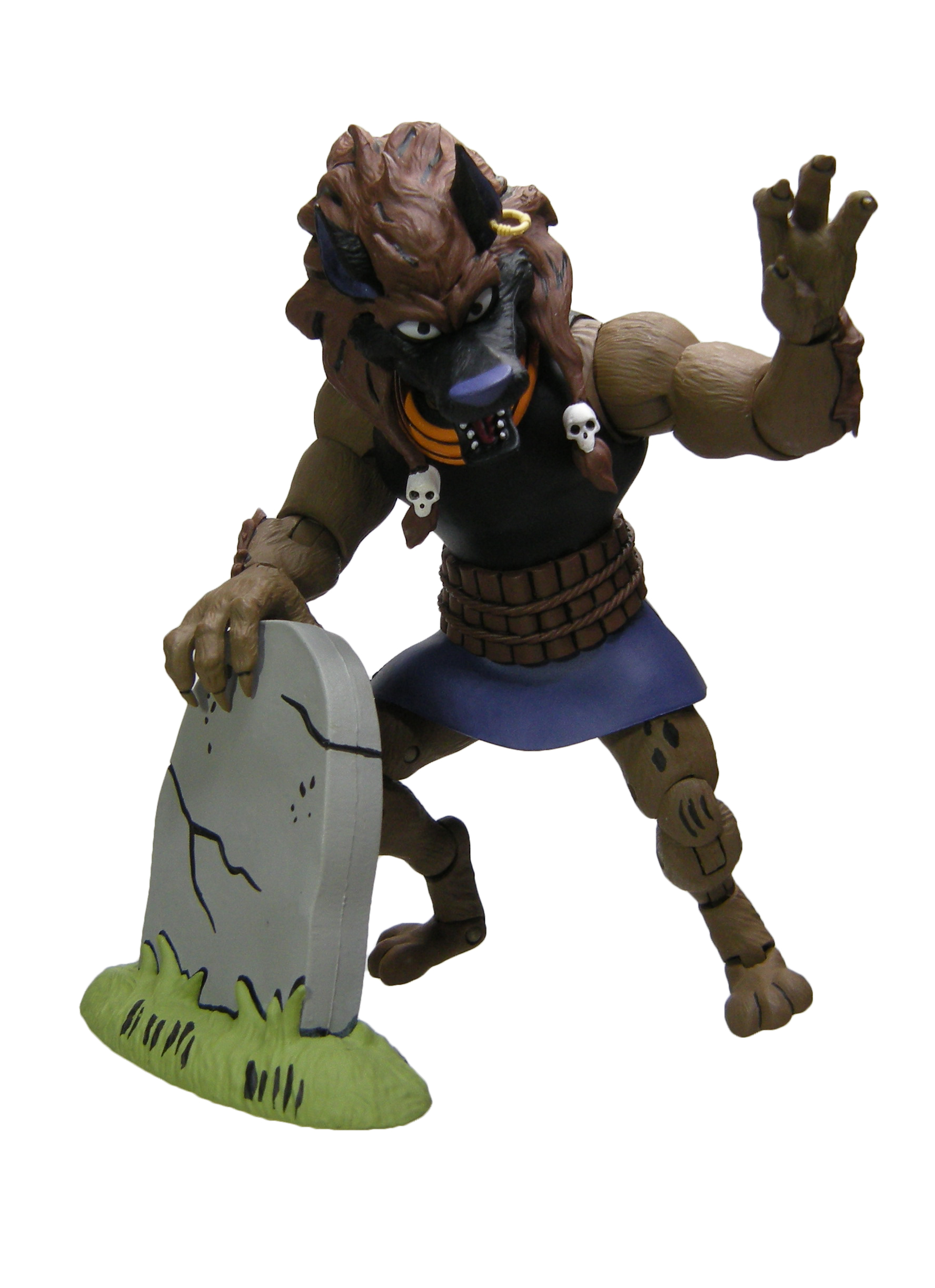 La pierre tombale fait référence directe au Mighty Mutanimals Mini-series #2, lors d’un flashback où Dreadmon raconte ses péripéties passées. Il n’est hélas pas possible de le faire tenir dessus malgré le grand nombre d’articulations du loup. Je n’aurais pas été contre un petit peg caché pour l’y fixer dessus. Ou l’ajout de quelques mains de morts vivants pour les disposer à proximité de la pierre.