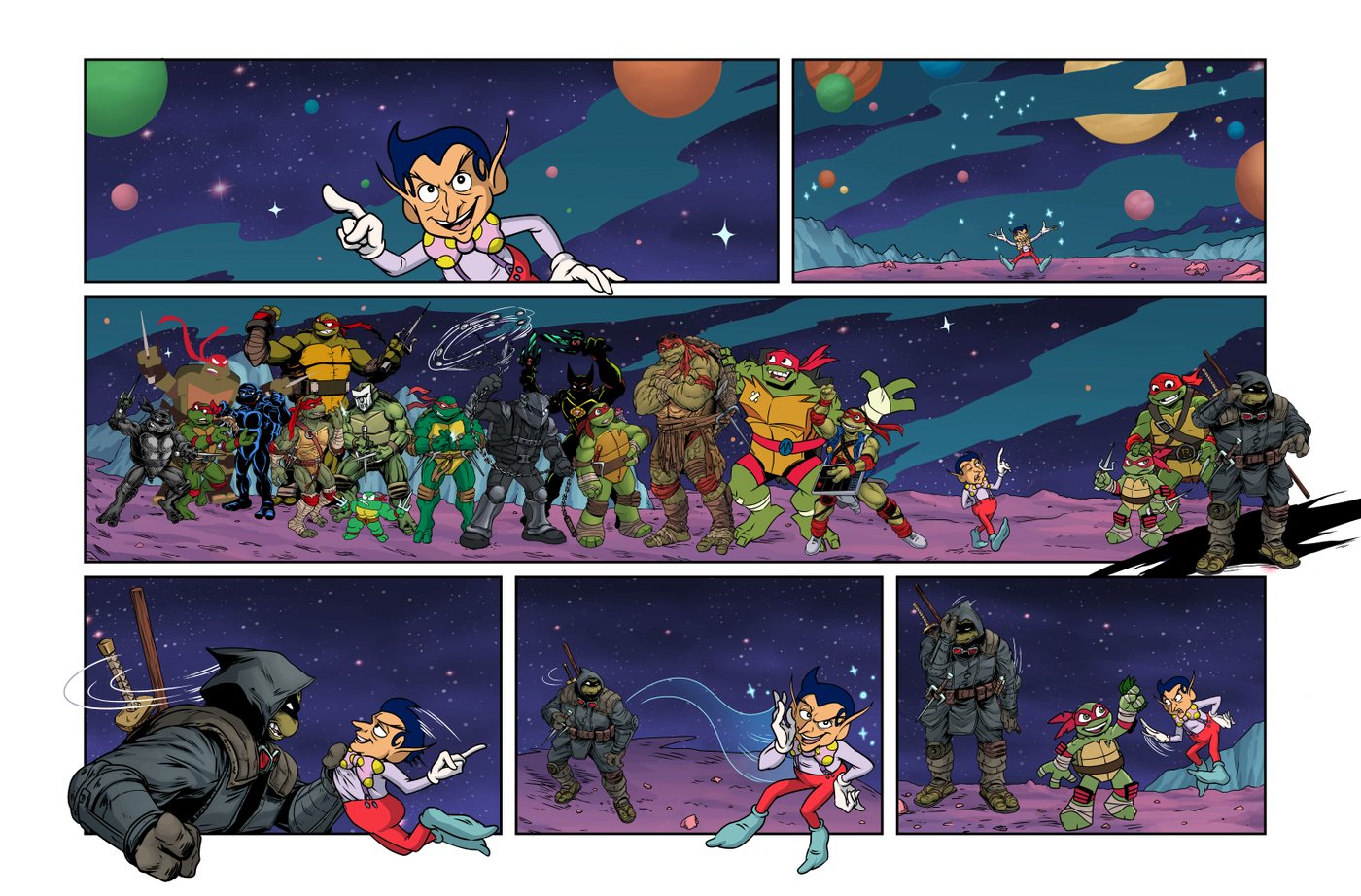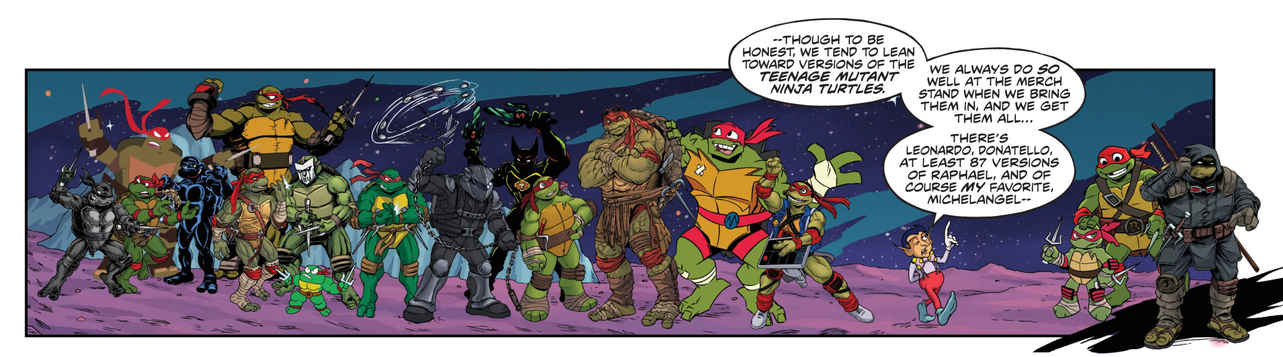 - La backup de Monsieur Ogg permet de faire se rencontrer les tortues de nombreux univers au détour des cinq numéros de la mini-série. Si tous les univers sont représentés ici, l’accent sera porté seulement sur les plus populaires.