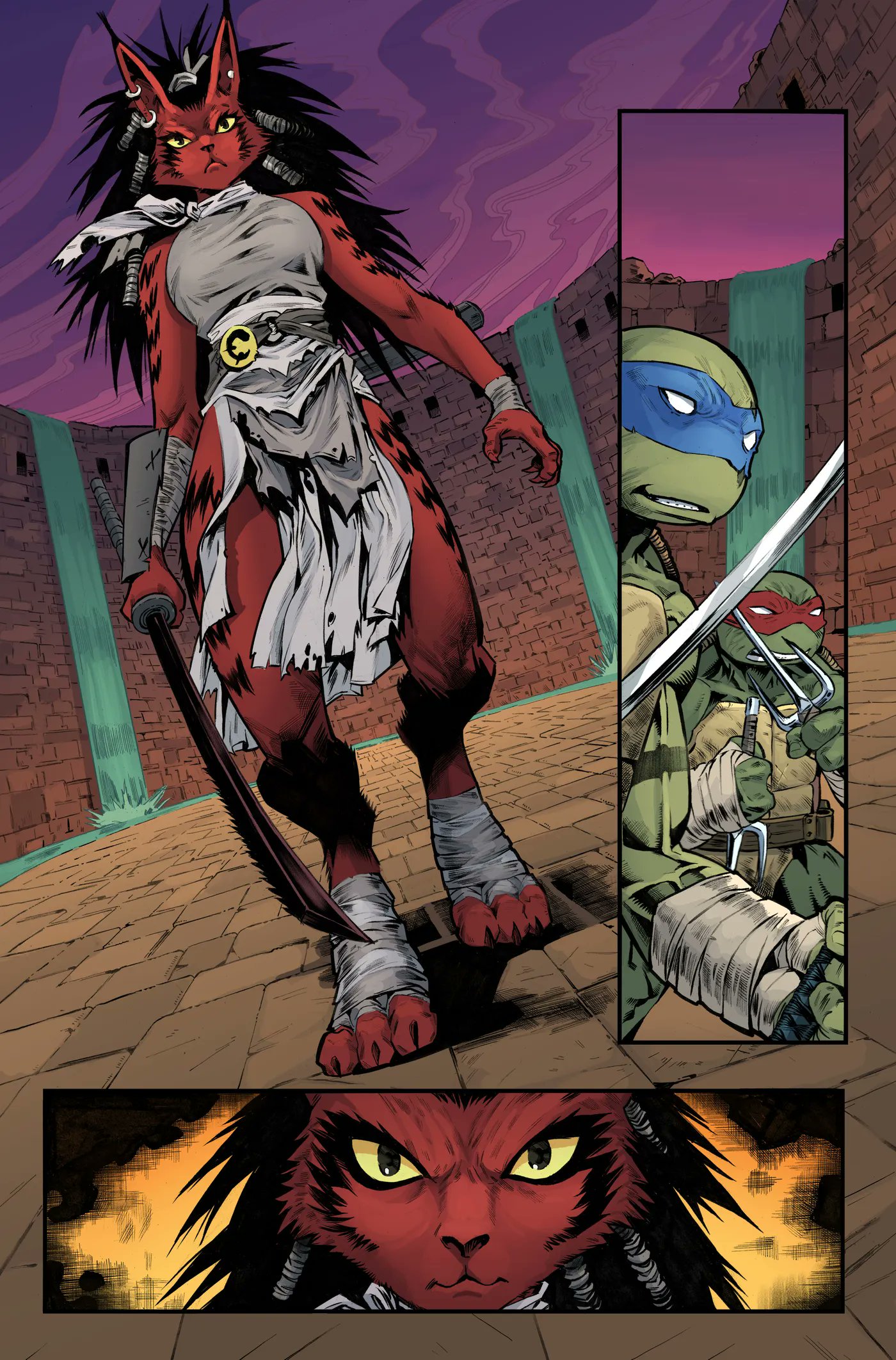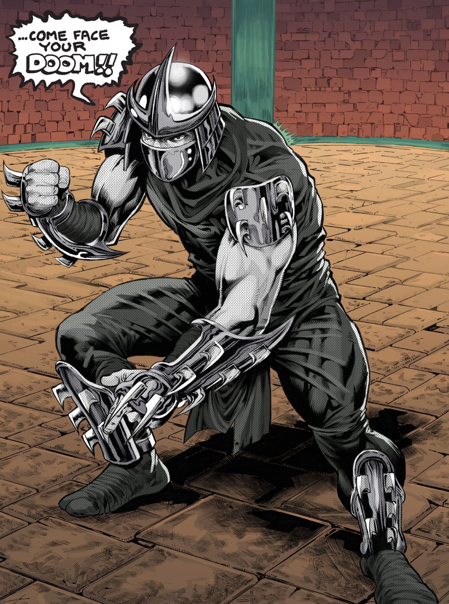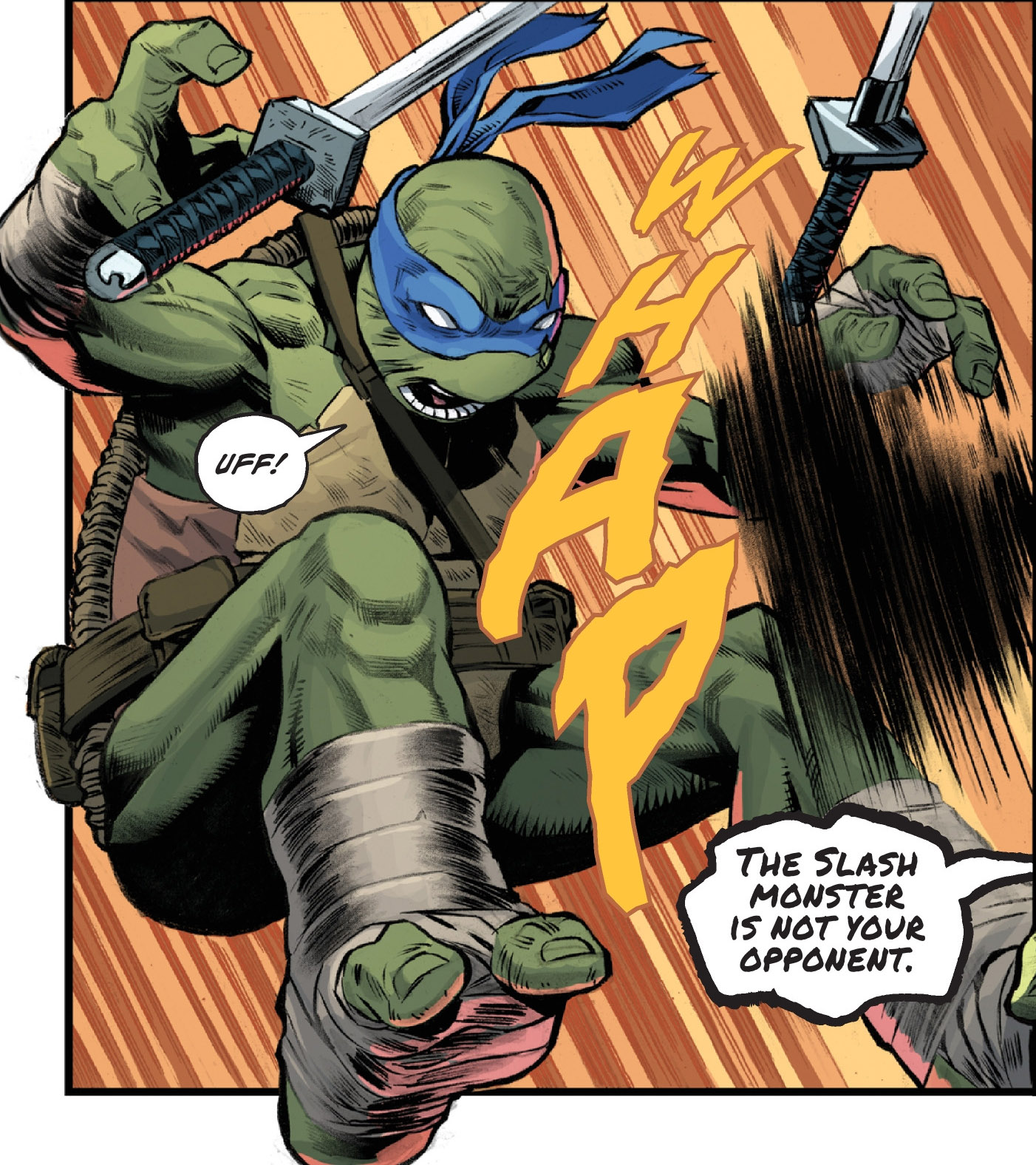 Leonardo refusait de se battre contre un ami. Mais tourné vers Romero, il ne voyait pas son adversaire lui porter un premier coup. Il ne s’agirait pas de Slash, mais de Shredder. L’homme, au teint noir et blanc se tenait prêt pour le détruire.