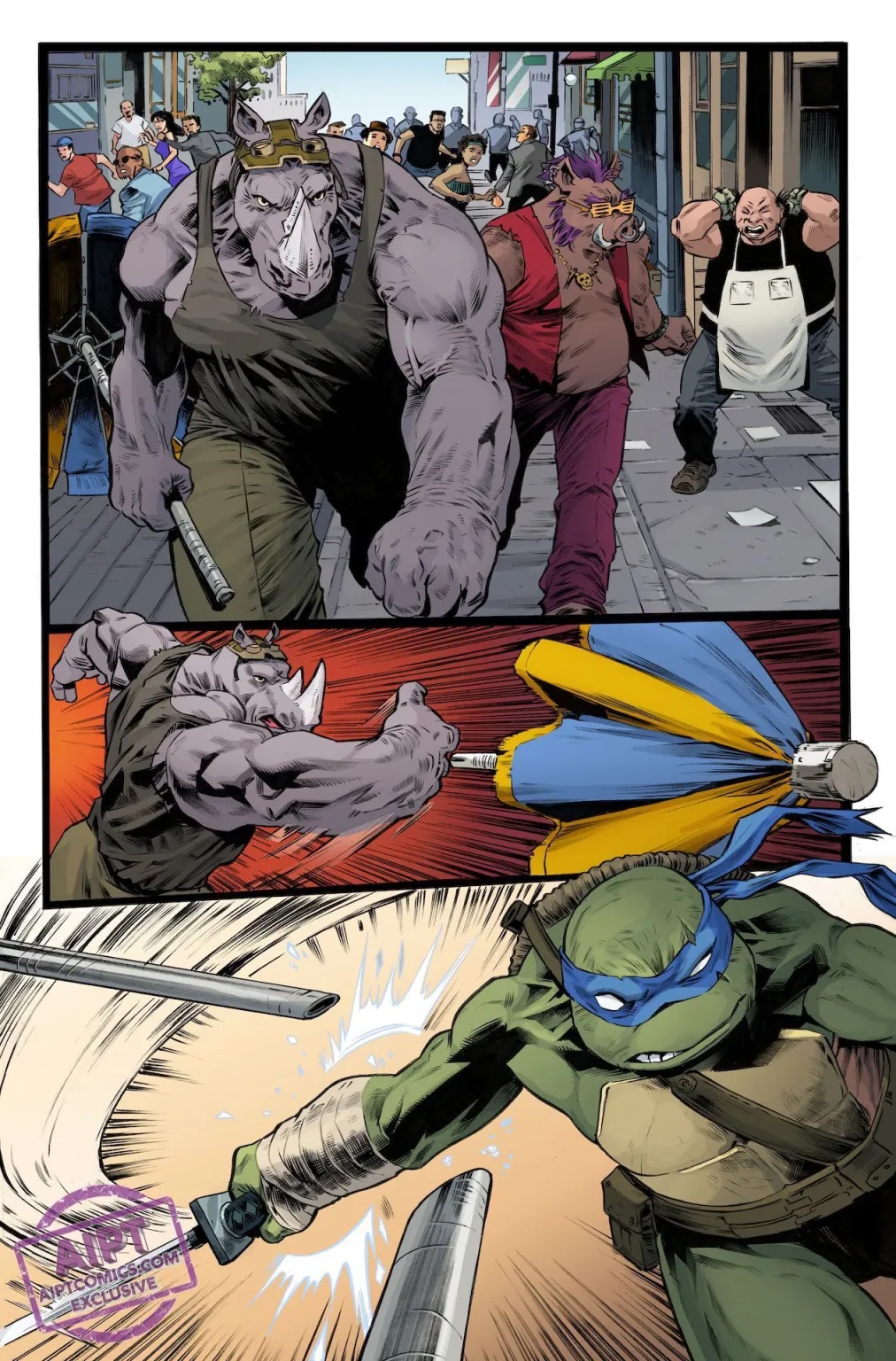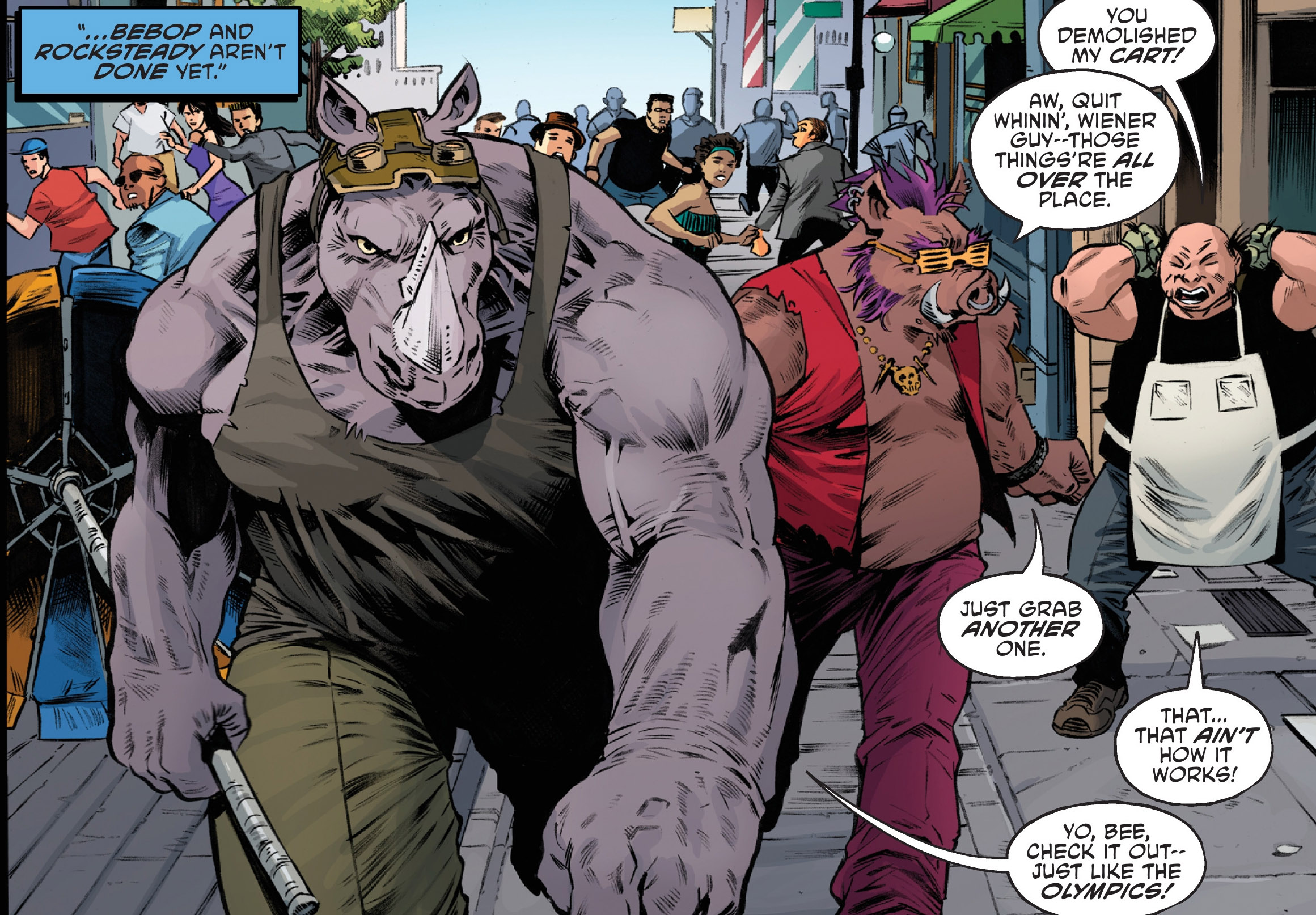 Dans les rues de New York, les tortues affrontaient Bebop et Rocksteady. Les deux mutants étaient comme toujours très coriaces et lançaient sur les quatre frères un charriot de vendeur de hotdogs. Les reptiles se demandaient pour quelle raison ils se faisaient attaquer de la sorte alors qu’ils se promenaient simplement dans la rue. L’homme qui tenait le stand leur révélait que le phacochère et le rhinocéros s’amusaient à racketter les commerçants pour leur propre compte. Encore un écart dont Karai n’avait pas eu vent.