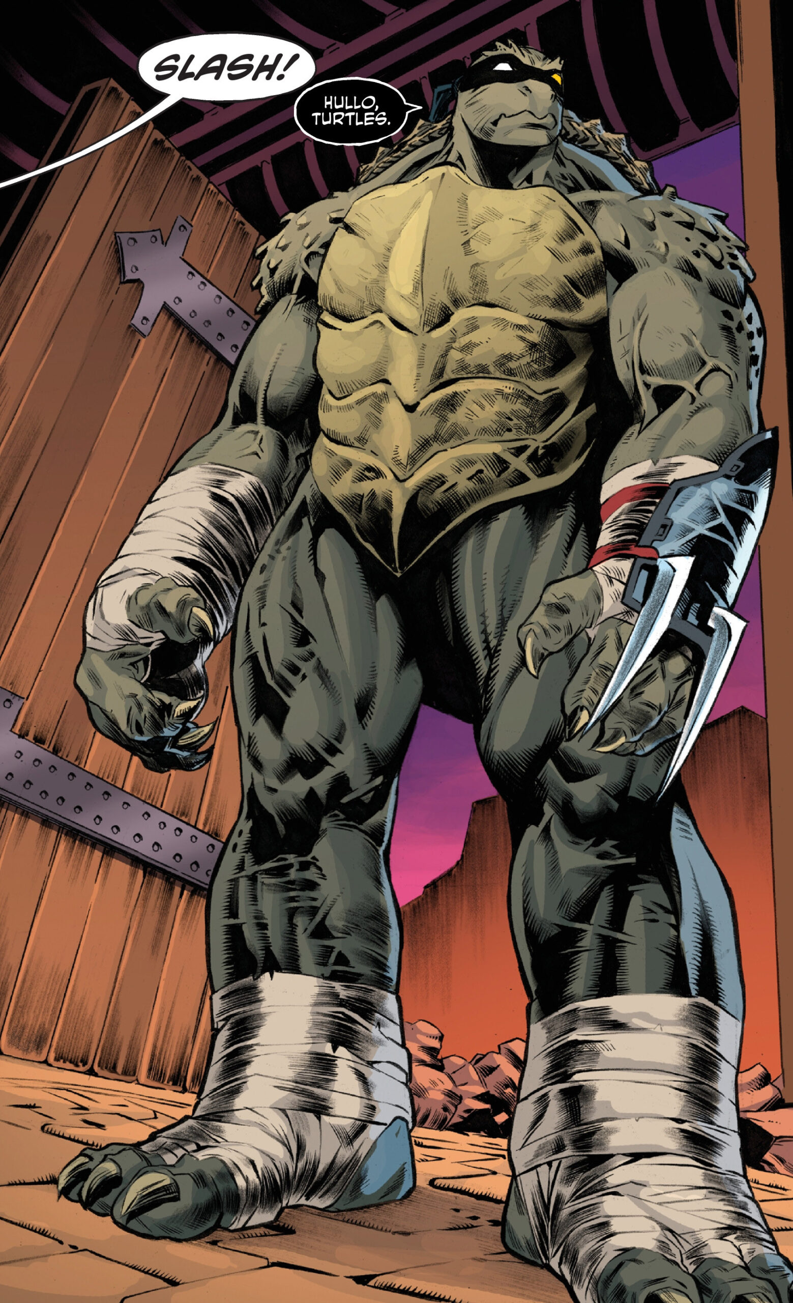 Savanti Romero s’était appliqué à réunir tous ses troubles fêtes au même endroit pour en finir. Il faisait apparaître son grand champion, chargé de livrer bataille aux tortues, Slash. Les quatre frères étaient extrêmement surpris de voir leur ami, tué dans l’explosion atomique au large de Burnow Island (TMNT (Vol. 5) #88) se tenir face à eux. Le mutant revenu d’entre les morts semblait aller bien et reconnaissait même ses amis.