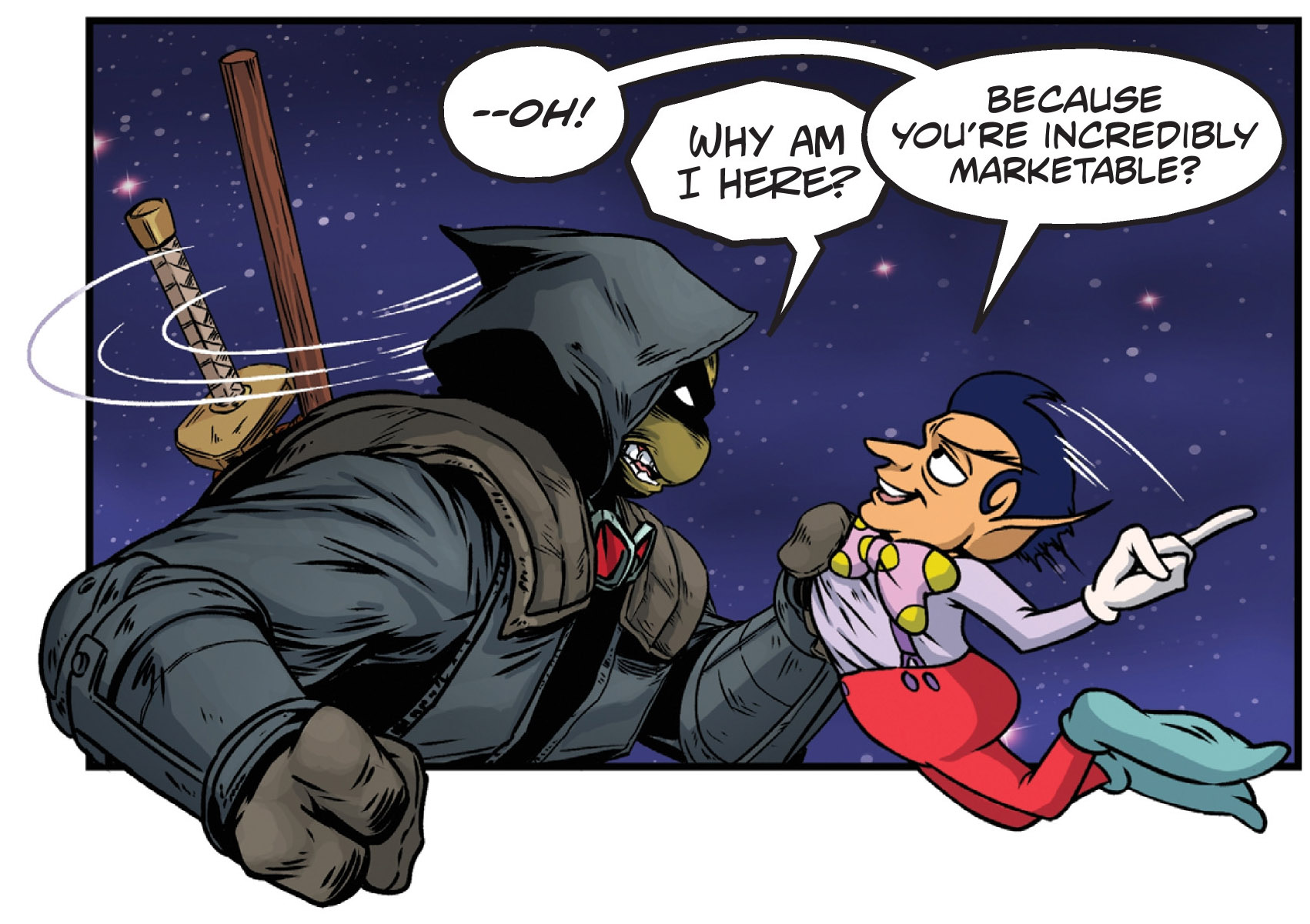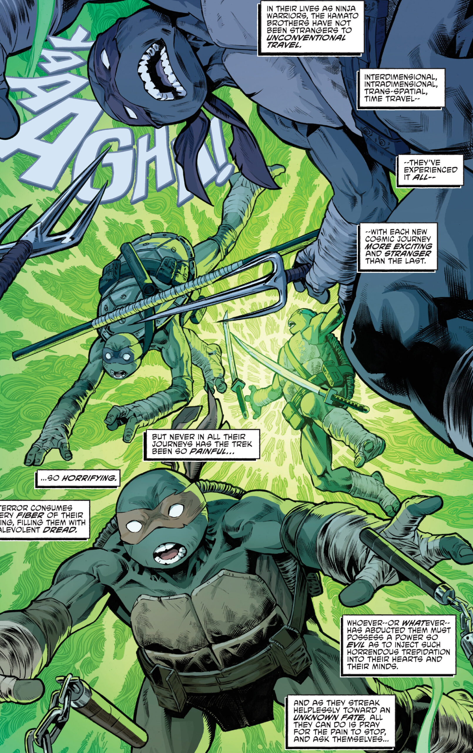 Alors que les six mutants s’expliquaient, un passage s’ouvrait dans le dos des ninjas. Ils entendaient deux voix familières qui se disputaient ; une féminine et une masculine. La première cherchait à avertir ses amis tandis que l’autre cherchait plutôt à la faire taire. Soudain, les tortues se faisaient happer par le portail verdâtre, sans même pouvoir lutter.