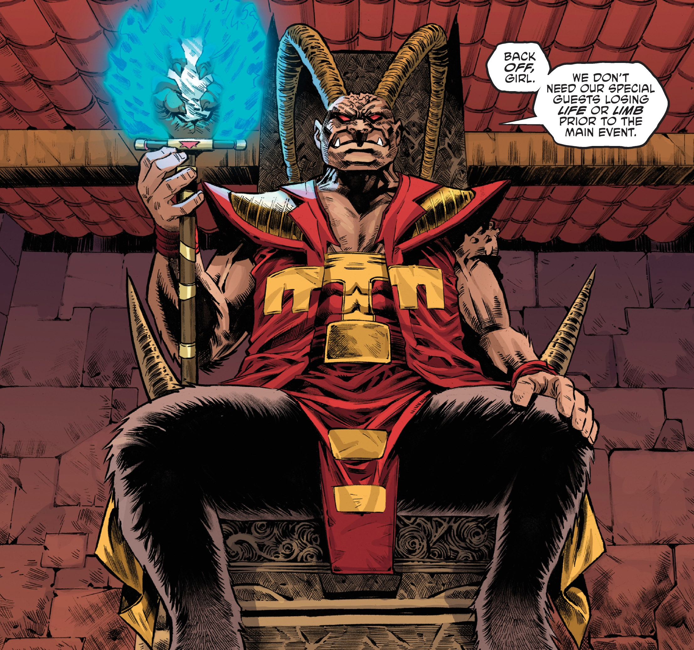 Hélas, il n’y avait pas le temps pour des explications. La bête à corne sournoise repoussait trois des quatre tortues des pouvoirs de son sceptre pour que le premier combat commence. Chaque ninja affronterait un ennemi, à commencer par Leonardo. S’il remportait le combat, il serait libre. Dans le cas contraire, il risquerait de souffrir comme tous les perdants de ses jeux. Les trois autres adolescents regarderaient leur frère en étant assis et les pieds et poings liés par des chaînes.