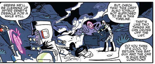 Dans le ravin où avaient été précipités Wingnut et Screwloose, un portail s’ouvrit. Deux maîtres du temps venaient inspecter les lieux, détectant des restes qui n’appartenaient pas à cette réalité. Ils devaient nettoyer les débris temporels éparpillés par la bourde de Bebop et de Rocksteady avec le sceptre de Renet. Les deux mutants seraient placés dans un tube de stase dans un laboratoire avant d’être brûlés. Sentant une distorsion temporelle, ils partirent ; ce n’était pas dans leurs fonctions. Des yeux apparurent salivants d’impatience. Ce que la « chose » avait entendu était particulièrement intéressant.