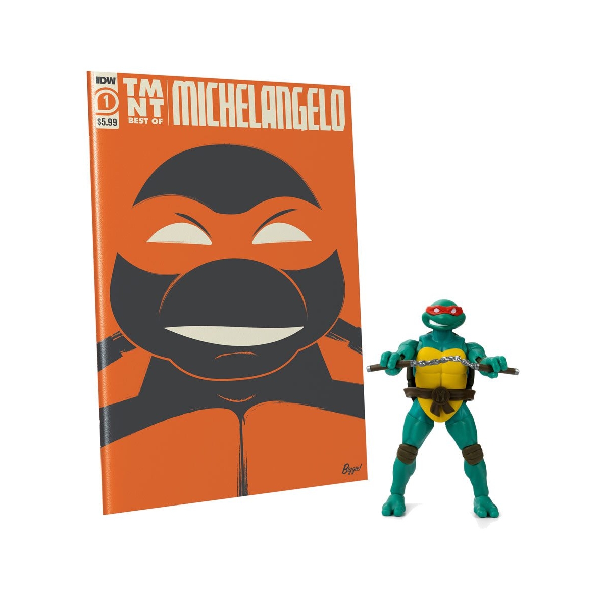 - TMNT BST AXN Michelangelo with TMNT Best of comic book bundle – James Biggie. Le comic a été réédité en exclusivité pour Walmart, en partenariat avec The Loyal Subjects, fournissant une figurine de Michelangelo.