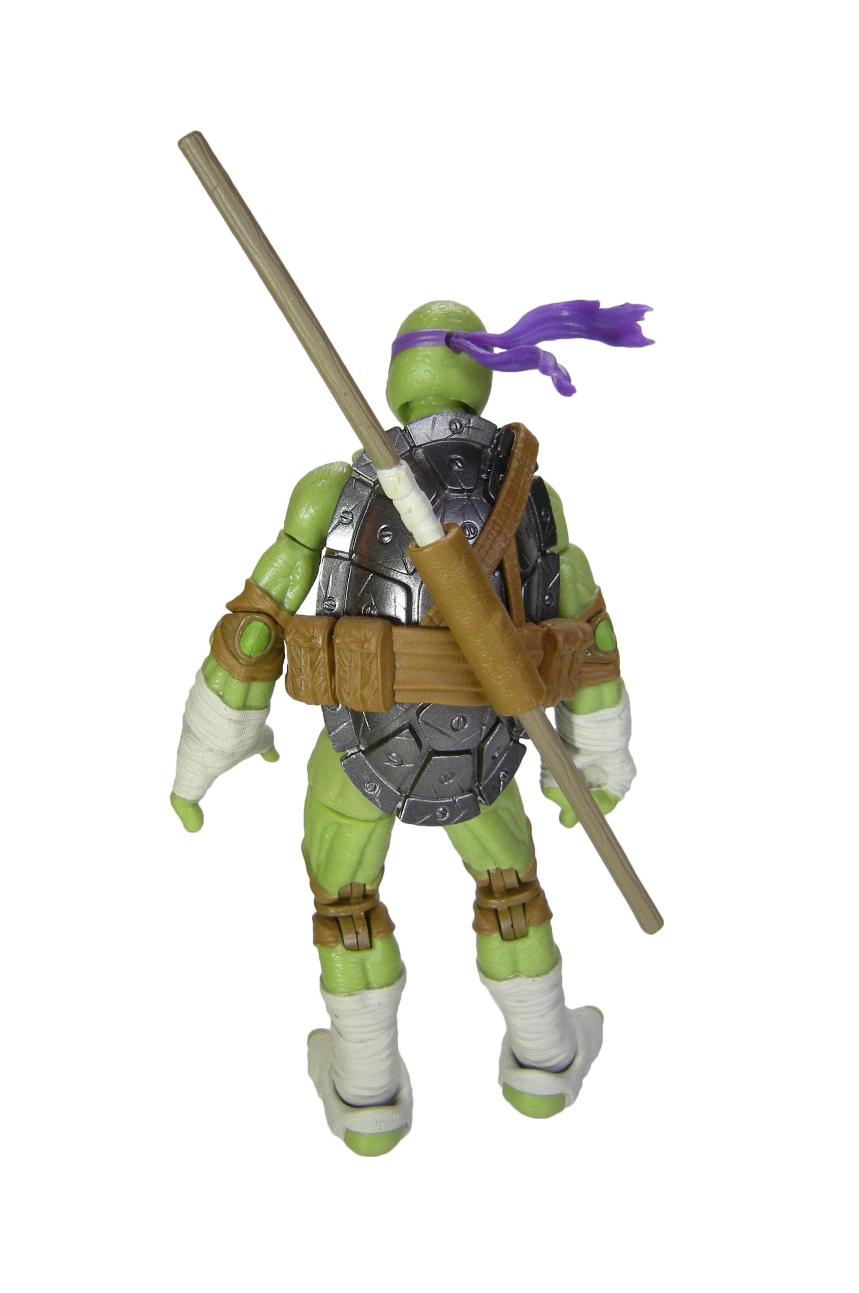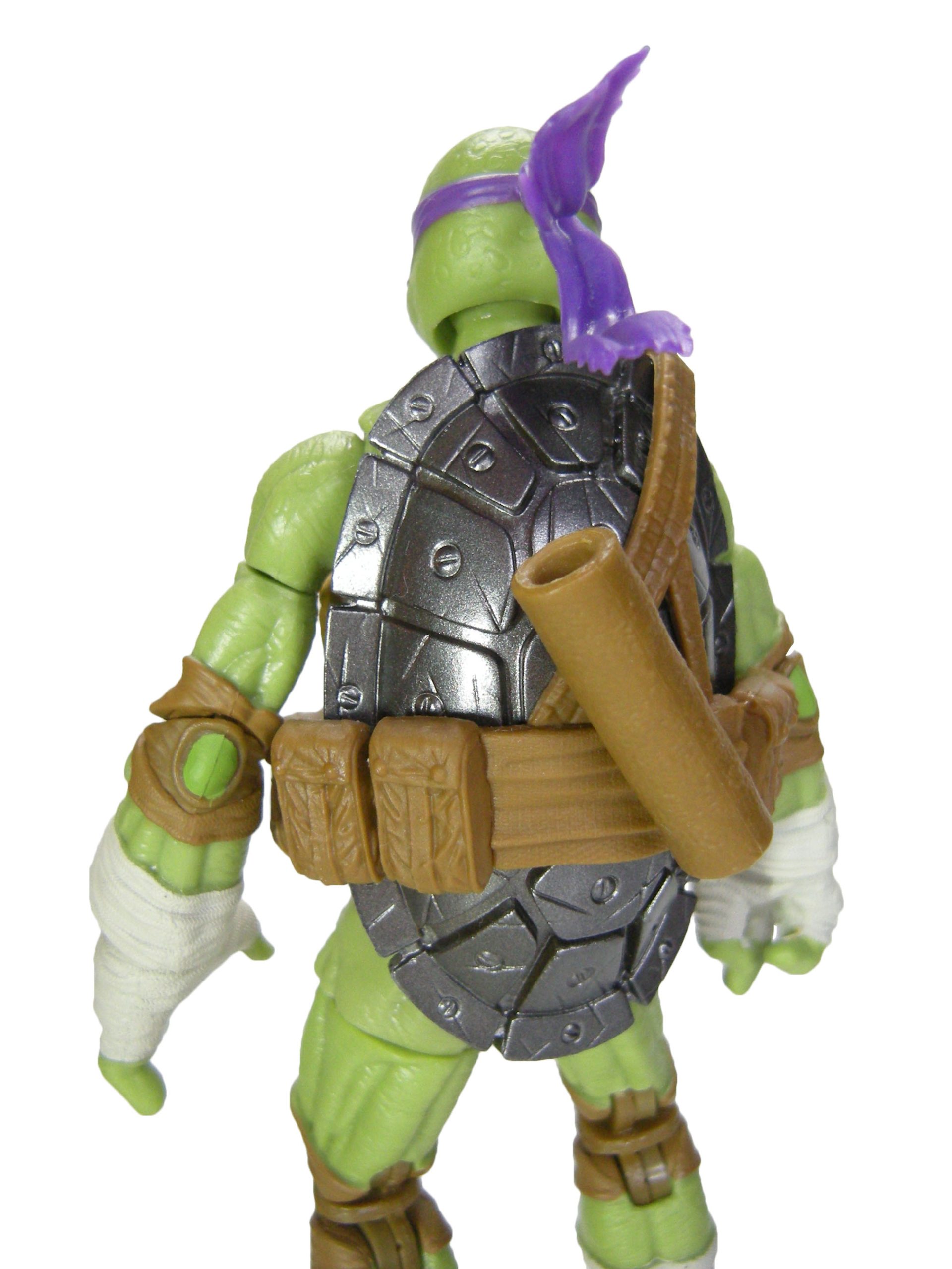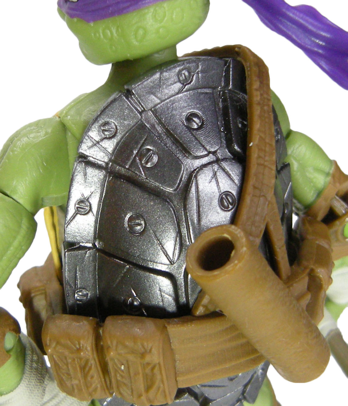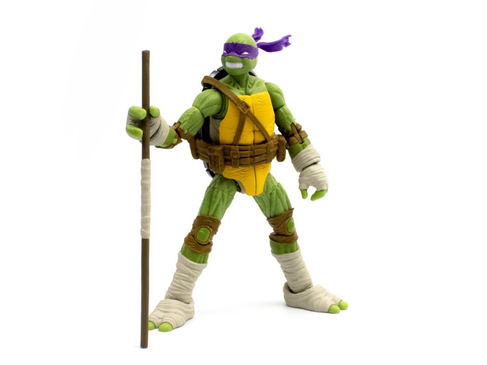 La figurine de Donatello est, comme le reste de ses frères, très détaillée. La peau du mutant est terriblement texturée, entre plis, écailles, veines… Le rendu est très intéressant. À cela, rajoutons également un très bon travail sur les détails du plastron, riches en éraflures. La carapace de Donatello est celle de remplacement (TMNT #50), qu’il obtient après son accident (TMNT #44). Elle est bien plus lisse que celle de ses frères avec de grosses vis qui permettent de la maintenir à son dos. Malgré le fait qu’elle soit en métal, celle-ci présente de profondes éraflures.