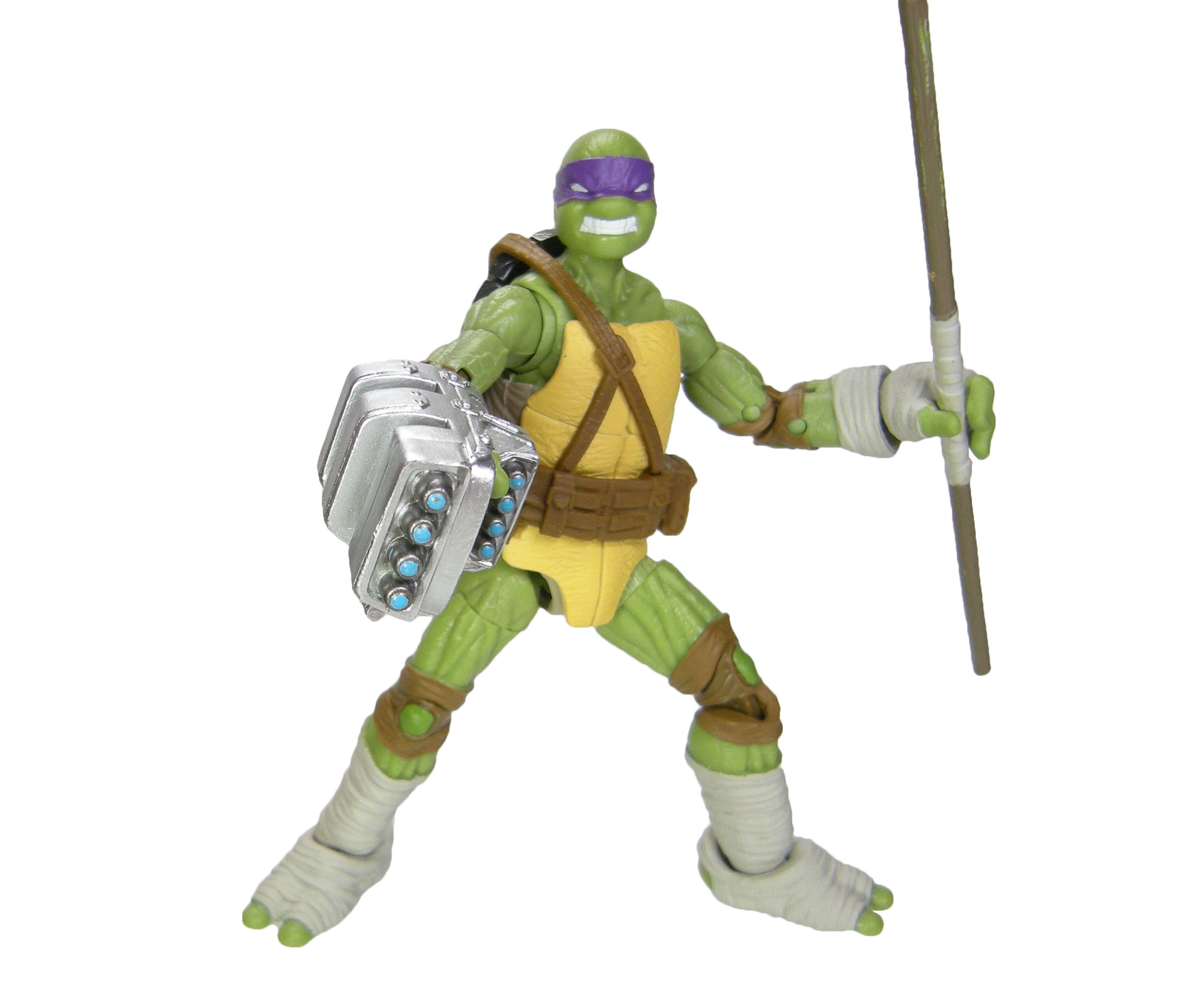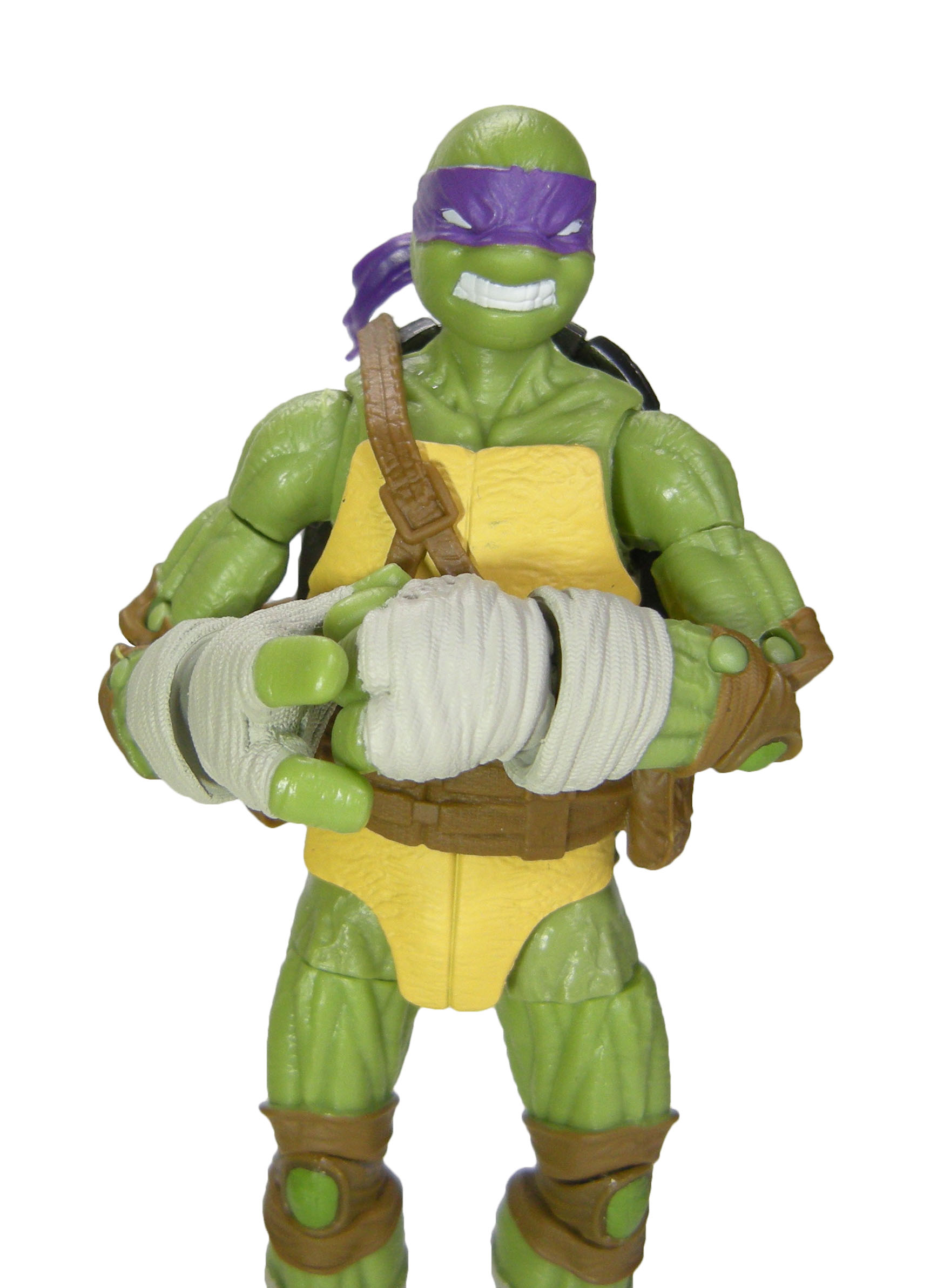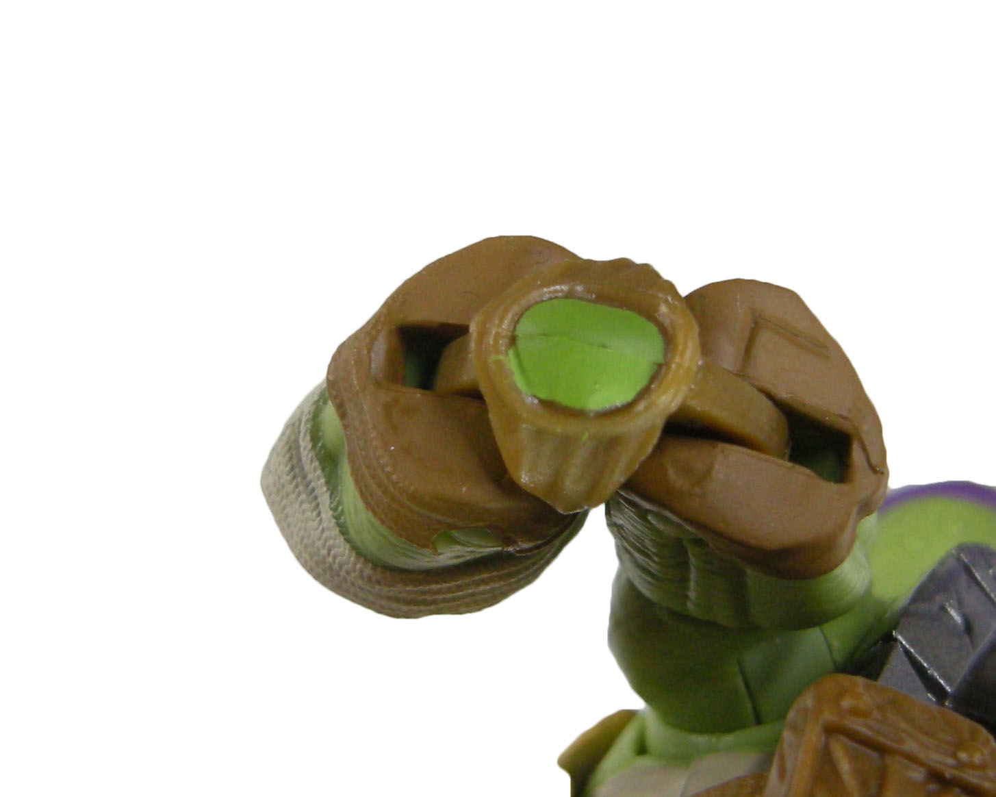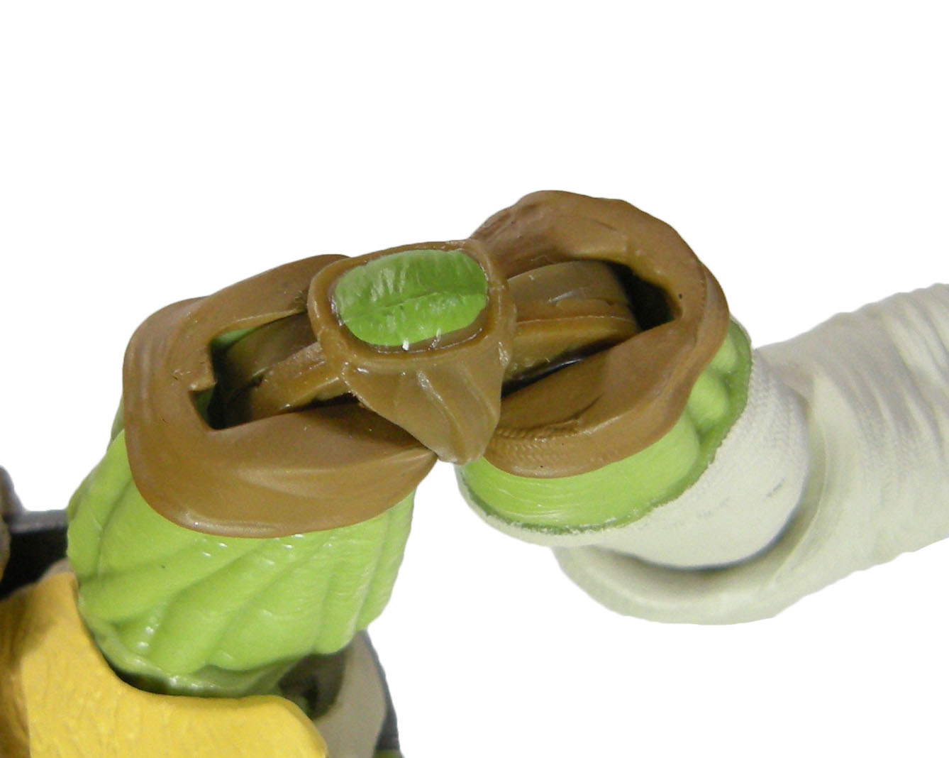 Le bâton de Donatello est malheureusement bien court. Une fois encore les deux mains de la tortue, on sent qu’il manque quelques centimètres de longueur. Par ailleurs, les bandes blanches qui s’enroulent autour sont très épaisses et glissent très mal entre les doigts de la tortue. Elles empêchent également de bien ranger l’arme dans l’étui à la ceinture.