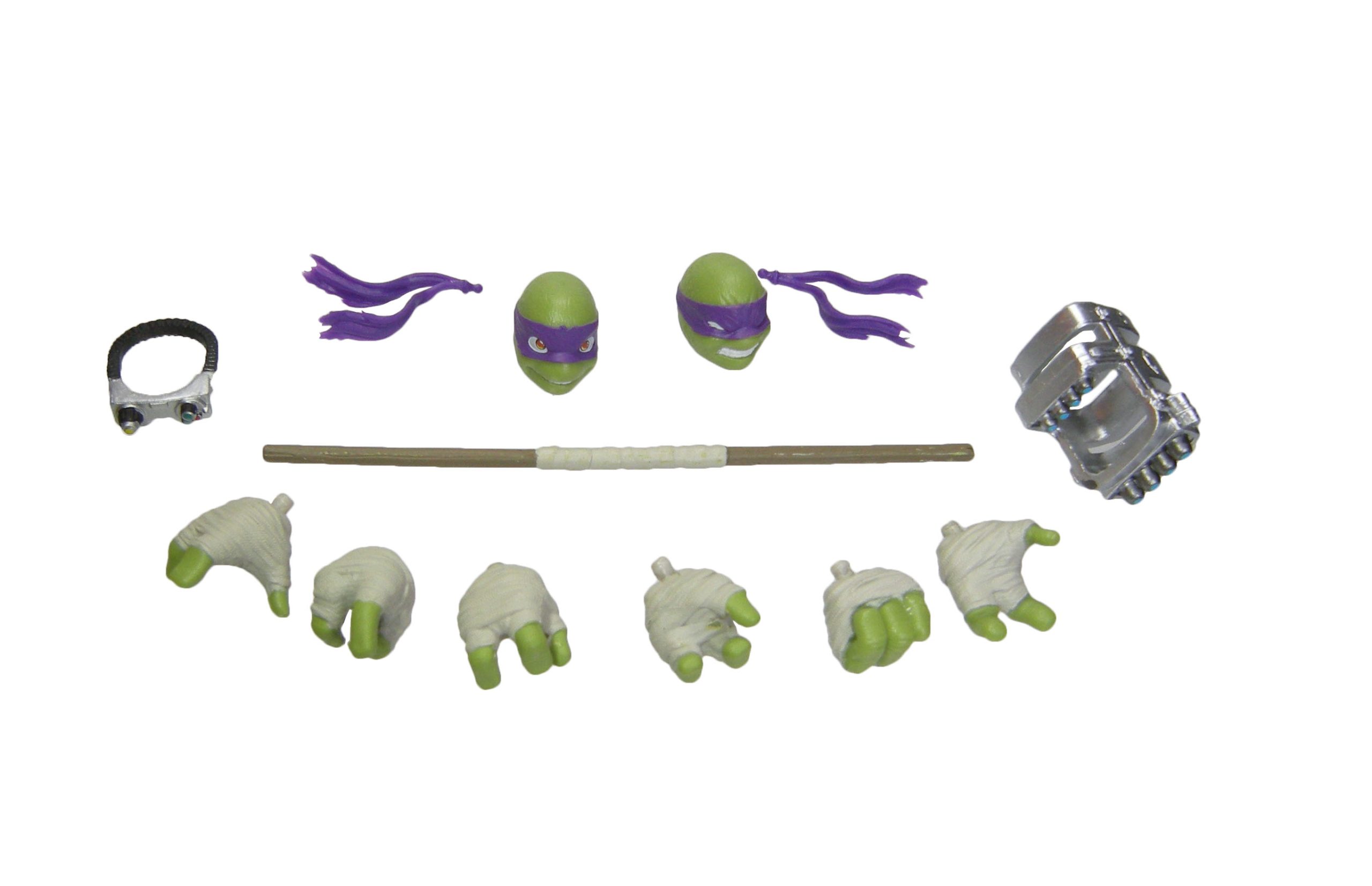 The Loyal Subjects propose un certain nombre d’accessoires avec son Donatello. Deux têtes interchangeables, trois paires de mains, un bâton, deux bandeaux (identiques), un gantelet anti-gravité et une paire de lunettes.