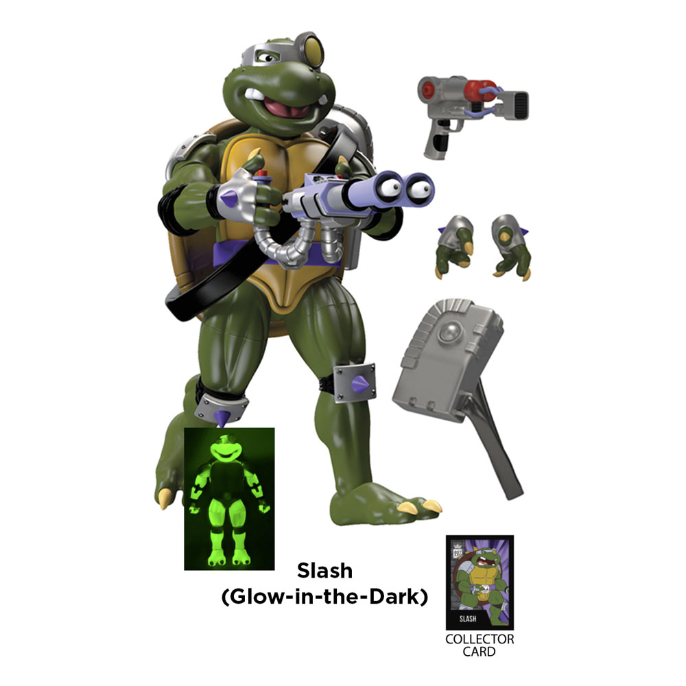 Slash a vu le jour en deux versions, une classique et une glow in the dark. Les deux reprenaient la même sculpture et les mêmes accessoires. Cette version de Slash est bien plus fidèle à la deuxième apparition de la tortue, dans l’épisode Donatello recycle (S6 E11). Exit les sabres, la tortue revient sur Terre avec une technologie extraterrestre !