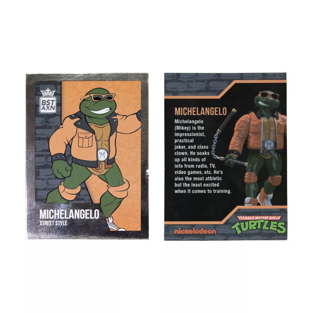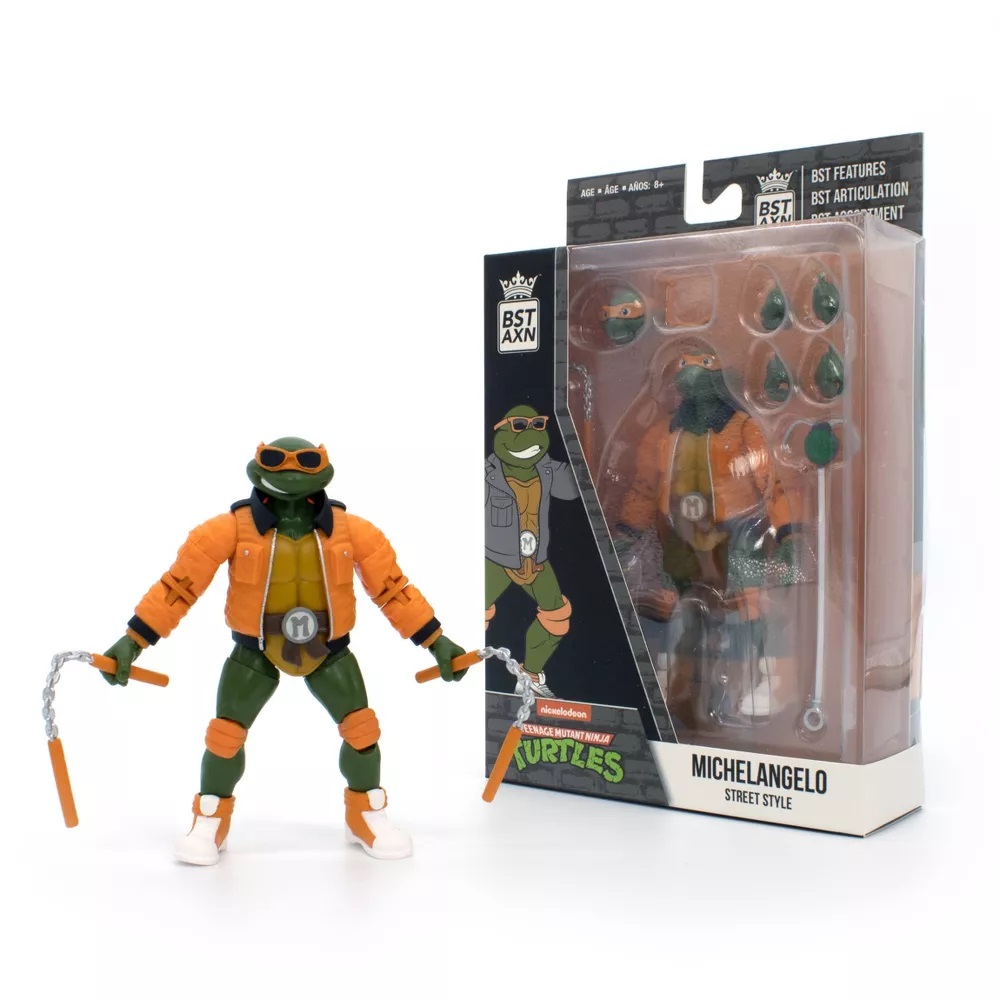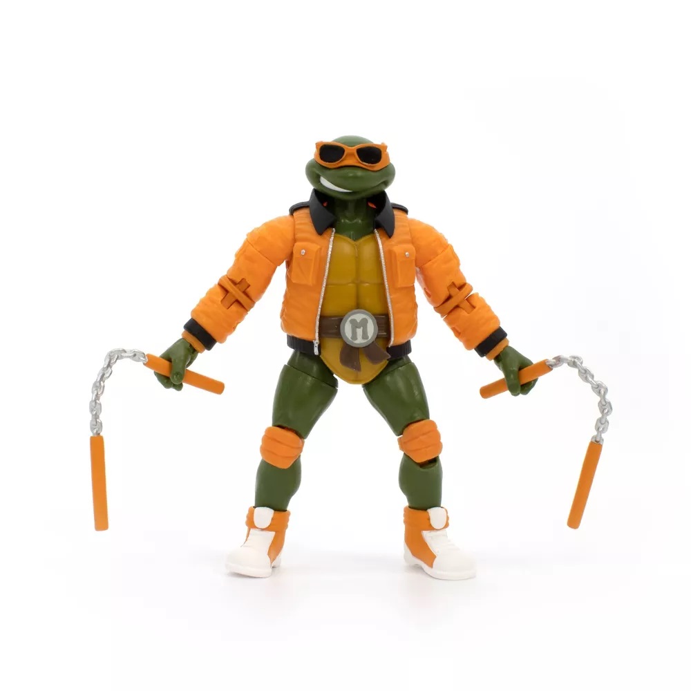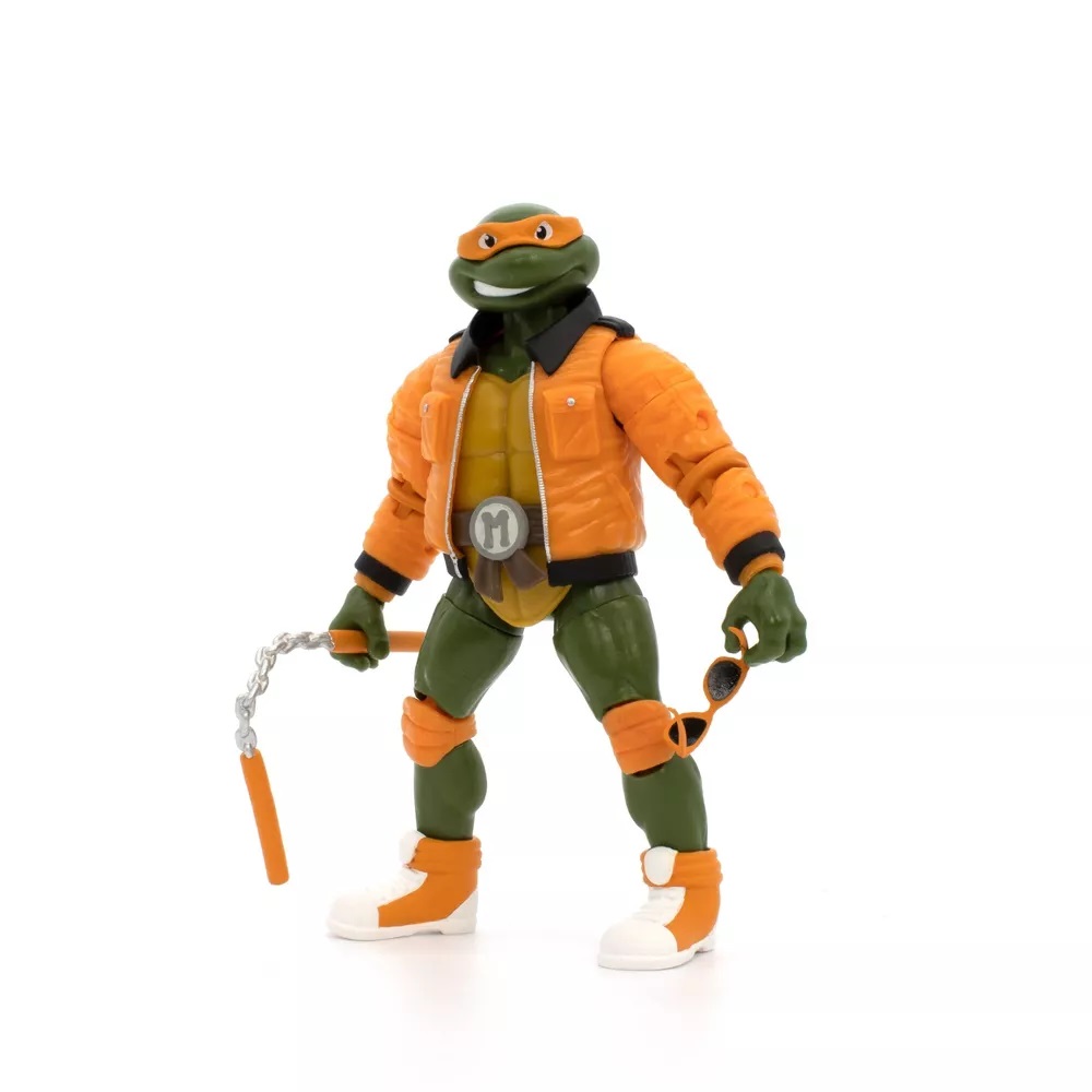 Chaque tortue dispose de trois variante en termes de peinture et d’un accessoire qui change d’un style à l’autre. Le Michelangelo main jacket possède un walkman. La version windbreaker possède un grappin et des nunchakus sans pointe et la version letterman un poste de radio et des lunettes à branches blanches.