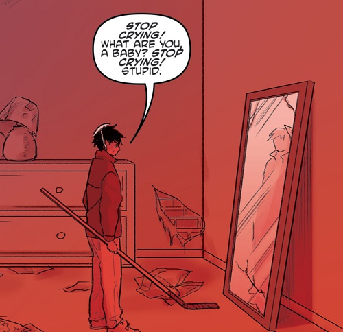 Sur ses pas, Casey avait rencontré un jeune garçon replié sur lui-même. Il s’agissait de lui, plus jeune. En larmes, il saisissait sa crosse de hockey pour frapper le visiteur qui ignorait où il se trouvait. Se regardant dans un miroir, cette jeune version de lui-même était décidée à en découdre avec son père qui le frappait. Après avoir donné un coup de crosse au véritable fils Jones, il prenait la fuite. Les mots de l’homme amateur de yoga et de thé lui revenaient en tête (Casey & April #2). La vie de Casey Jones étai réellement chaotique, basée sur la tristesse, la violence et la méfiance. Il avait refusé de l’écouté à sa rencontre, pensant qu’il affabulait. Il était dans le vrai.