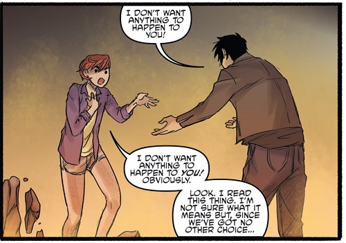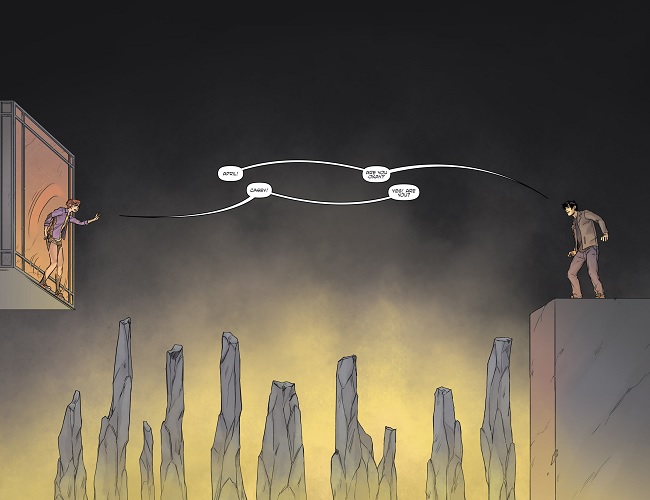 Commençant à comprendre la logique de l’endroit où elle se trouvait, elle traversait les murs comme si de rien n’était et se mit à appeler Casey. Le garçon courait dans tous les sens à la recherche de la sortie. April l’entendait. Il n’en fallait pas plus pour bientôt les réunir. Hélas, un gouffre les séparait. Seuls quelques pics rocheux parsemaient ce vaste obstacle. Ils n’avaient guère d’autre choix que de sauter de pierre en pierre. Casey faisait le premier pas, incertain, pour rejoindre son amie. Le voyant en difficulté, April sautait à son tour pour le rejoindre. Se disputant, l’un ne voulant pas voir l’autre risquer de tomber, April saisissait Casey. Elle repensait alors au message qu’elle avait vu au sol et se demandait si la seule manière de s’en sortir n’était pas simplement de sauter. S’ils voulaient espérer s’en sortir, il n’y avait pas d’autres solutions finalement.