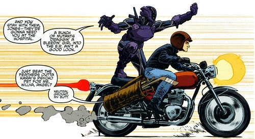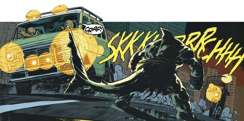 La route n’était pas encore sécurisée. Alors qu’ils longeaient la baie, Bludgeon bondit de l’eau pour leur barrer la route. Le Turtle van l’esquiva, mais le requin saisit Casey, sur sa moto, pour le tuer, vengeant ainsi son amie Koya, mal en point. Hors de question pour Raphael de perdre un autre des leurs. Il sortit de la fourgonnette en direction du mutant et lui planta ses saïs dans le dos pour le faire lâcher prise. Michelangelo prit le volant.
