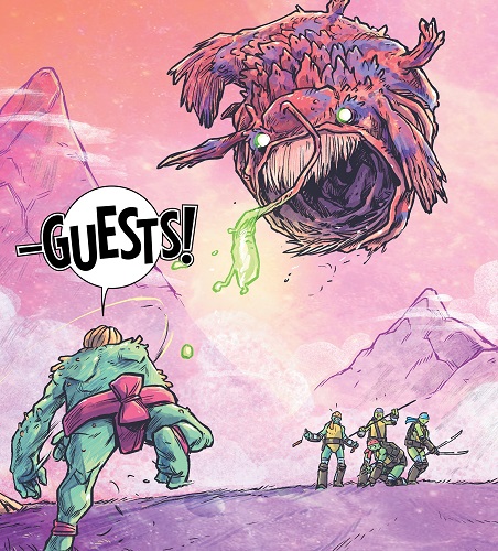 Il y a cinq ans de cela, Anemon était un loyal guerrier de Krang. Il apportait un Argonien pour l’animal monstrueux de compagnie de l’utrom, unique espèce que sa créature tentaculesque semblait aimer manger. Mais il ne l’avait pas fait venir que pour nourrir son animal de compagnie. Il avait une mission de la plus haute importance à lui confier. Il devait lui fournir les coordonnées des temples cachés d’Akebono, lieu où son espèce avait pour coutume de cacher de la nourriture. Il en avait besoin pour nourrir ses armés à travers la galaxie. Anemon était partagé. Il était justement entré sous les ordres de Krang pour épargner son peuple. À présent, l’utrom menaçait les siens de famine. Il leur laissait deux choix ; la mort, ou rejoindre son armée. Anemon n’avait guère le choix et lui donna ce qu’il voulait. Mais pas tout à fait, il lui donna de mauvaises coordonnées. Krang le savait, il les connaissait déjà très bien. La planète avait déjà été rasée depuis longtemps. Il testait la loyauté de son soldat. Ses gardes se précipitèrent sur lui, l’un d’eux sauta sur son dos et poignarda ses yeux. Il parvint à se défaire des hommes de main de l’utrom et prit un vaisseau pour s’enfuir. Son voyage était très incertain, ayant perdu la vue. Tout ce qui comptait pour lui était de s’éloigner des menaces de Krang. Son vaisseau percuta un poisson volant géant, une cloud beast, sur une planète sauvage. La créature était sur le point d’avaler Eymo, une petite créature en forme d’œil qui lui était extrêmement reconnaissante et lui proposa de l’aider en guise de remerciement. Anemon resta à sa ferme durant une année, vaquant à différentes tâches domestiques et protégeant Eymo. Un jour, il s’approcha de l’œil et lui dit que leur relation devait évoluer. Il le saisit et le planta sur son crâne, entre ses cheveux et s’en servit comme nouvel œil. Telle était l’histoire qu’Anemon racontait aux tortues, qui venaient de poser le vaisseau en catastrophe sur sa planète après avoir été attaqué par une de ces cloud beasts. Donatello ne comprenait pas comment l’individu pouvait réduire ainsi à l’esclavage une créature sans défense. Leonardo ne voulait pas aborder la question pour le moment, ils devaient se focaliser sur leur mission et convaincre Anemon de les suivre. Mais pour le colosse aux allures de sumo, il était hors de question de les suivre. Il ne voulait pas se venger, à présent il voyait le monde différemment. C’était la loi du plus fort. Les tortues devenaient à ses yeux insolentes et leur promis de leur coller une correction exemplaire si elles continuaient. Leonardo saisit l’opportunité pour le défier. S’il gagnait contre lui et ses trois frères, ils partiraient. Le cas contraire, il devrait témoigner au procès de Krang. Anemon accepta le marché. Il affronterait une tortue à l’heure de chaque repas le lendemain. Le soir venu, les tortues élaboraient un plan pour mener leur mission à bien. Repliées à quelques dizaines de mètres de la ferme, à côté du vaisseau neutrino que Donatello tentait de réparer. Raphael serait le premier à se battre, pour le petit déjeuné. Suivrait Donatello, puis Leonardo. Michelangelo était quant à lui chargé d’une mission de la plus haute importance. Il devrait confectionner des pizzas dont seul lui avait le secret pour épuiser Anemon. Quoi de mieux qu’un repas copieux pour faire une bonne sieste ?