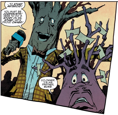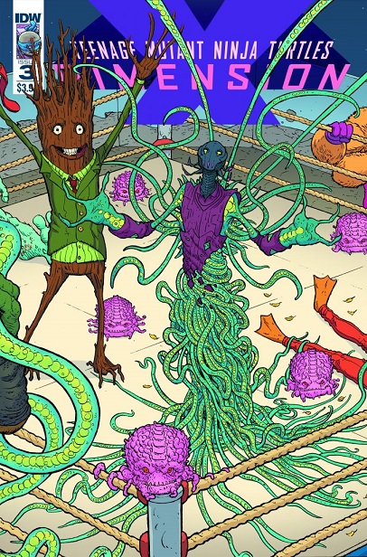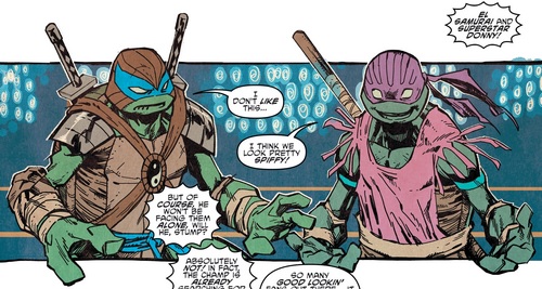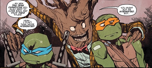Michelangelo était le plus enthousiaste. Ce voyage s’annonçait grandiose pour lui. Comme une pile, il ne tenait plus en place et ne put s’empêcher de demander au premier individu qu’il vit quel était son nom de scène. Mauvaise pioche, il s’agissait d’un agent. Mais celui-ci accepta de lui présenter son client, Manfred Manos. La tortue était quelque peu déconcertée face à ce joueur possédant un énorme corps et trois paires de bras. Les tortues devaient rester ensemble, dans la foule de catcheurs et autres étranges créatures autour d’elles. Pour une fois, ce n’était pas elles qui allaient venir vers le témoin, mais ce dernier qui les trouverait, totalement par hasard. Il s’agissait de Stump, un commentateur sportif à la forme d’un arbre. Il était accompagné de son partenaire, Sling. Tous deux prenaient les nouveaux arrivants pour des journalistes et Stump s’apprêtait à leur livrer avec grand plaisir une interview. Leonardo l’interrompit immédiatement pour lui dire qu’il était attendu au tribunal de Neutrino. Le commentateur se ravisa, disant en panique qu’il avait déjà été jugé. Lorsqu’il apprit que c’était Krang qui allait finir derrière les barreaux grâce à son jugement, il ne semblait pas très enclin, malgré la destruction de sa planète – raison pour laquelle il avait créé cet astéroïde dédié au catch. Cela leur avait couté très cher, Krang avait été si bon de le leur financer… En remerciement pour le bois fourni depuis sa planète. Raphael voyait rouge, le témoin du procès était à l’origine de la destruction de sa propre planète. Il aurait tellement préféré laisser Hakk-R lui régler son compte… L’agacement de la tortue plaisait aux deux commentateurs qui étaient décidés à rester là pour le grand évènement Grappleganza. Ils leur proposèrent un marché. Si Raphael acceptait de participer à un combat, Stump se rendrait sur la planète Neutrino à la fin de l’évènement. Ses frères n’avaient rien contre, Michelangelo voulait même être son agent.