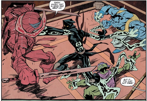 Après un passage aux vestiaires, Leonardo et Donatello entraient sur le ring avec de nouveaux costumes : El Samurai et Superstar Donnie faisaient leur entrée. Cryin’ Houn’, déjà sur le ring, regardait le public en délire pour choisir son partenaire de combat. C’était une créature plutôt forte, portant un de ses t-shirts de fan. Mais une lueur bleutée apparut devant l’individu. Leonardo serrait ses sabres entre ses doigts, prêt à fondre sur le nouveau venu : Hakk-R. À sa vue, Stump comprit immédiatement de qui il s’agissait et lança le match. Donatello frappait le nouvel arrivant de son bō, Leonardo lui tranchait ses tentacules. Cryin’ Houn’, qui n’avait d’autres choix que de faire équipe avec l’intrus lui demandait d’être plus coopératif.