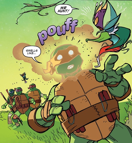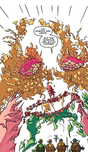 La petite polyglot qui avait reçue les tortues les emmenait bientôt dans les terres ravagées pour leur présenter les désastres de Krang. Ceux qui vivaient à cet endroit n’étaient plus les bienvenus sur le reste de Totus. Devenus des mutants, ils n’avaient plus aucune symbiose avec les autres plantes de la planète. Donatello lui demanda alors de quoi les plantes qui vivaient là se nourrissaient-elles. Leur guide cracha son pollen sur Michelangelo, en s’exclamant qu’ils chassaient. Plus de doute, si cette créature était si différente du reste de ce qui vivait sur Totus, c’est qu’elle était un mutant. Les tortues se précipitèrent sur elle. Raphael la bloqua de ses saïs contre un arbre. Le polyglot leur raconta l’enfer qu’ils avaient vécus lors de la destruction d’une partie de leur planète. Ils n’avaient pas à s’en faire pour Michelangelo, il serait bientôt sur pied.