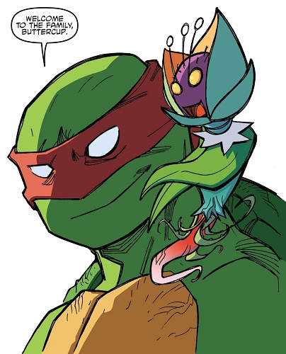 À peine avait-il prononcé ces mots que la tortue se relevait et se mit à courir. Il délirait. Soudain, un autre polyglot apparut, rappelant à celui qui était avec les tortues qu’il ne pouvait aller plus loin. Les plantes qui les entouraient se mirent à bouger et tout d’un coup, formèrent comme un rideau devant les tortues. Un visage se dessinait. Les plantes, l’esprit de Totus, demandaient aux quatre mutants de quitter leur planète. Le polyglot resterait. Leonardo et Donatello prenaient conscience que c’était toute la planète qui était le témoin, et pas seulement un individu comme ça avait été le cas à chaque fois jusqu’à maintenant. Mais comme la petite polyglot n’était plus en symbiose avec les autres plantes, elle devrait pouvoir quitter sa planète sans risquer pour sa vie. C’était une opportunité en or pour Totus de se faire représenter à l’extérieur. Elle deviendrait leur ambassadeur. Étant la 95480e fleur à avoir éclo, elle décida de se nommer Poly-95480, que Michelangelo abrégea en Polly. Elle serait la première totusienne à quitter sa planète. Polly en était enchantée et n’avait qu’une hâte, parler au procès contre Krang. Leonardo appelait le vaisseau neutrino. Ils pouvaient atterrir pour les faire embarquer et quitter Totus.