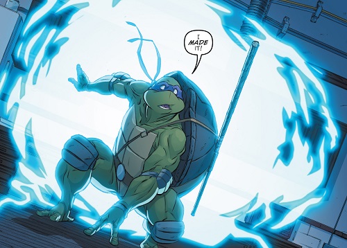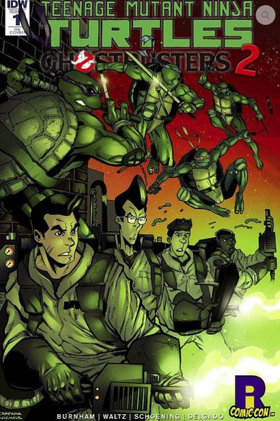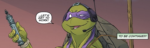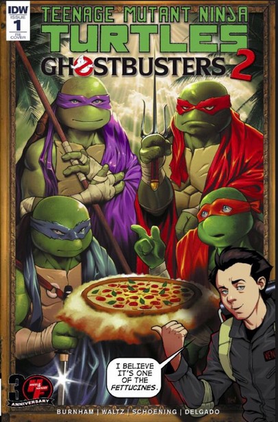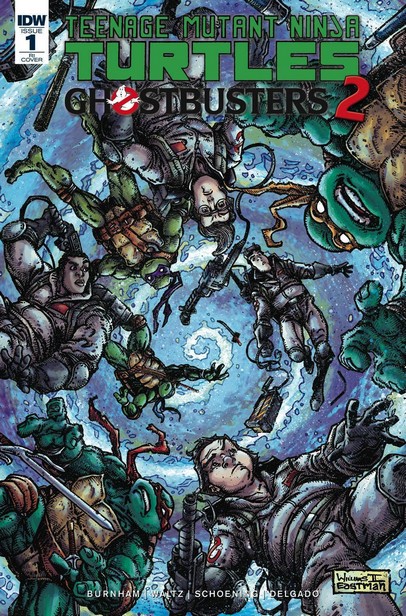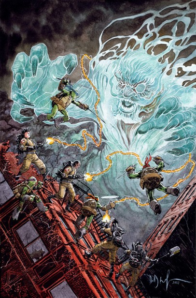 Dans son laboratoire, Egon Spengler travaillait sur un appareil avec Peter lorsqu’un portail s’ouvrit sous les yeux. Il s’agissait de Donatello, visiblement bien content d’être arrivé là. Il cherchait leurs amis chasseurs de fantômes pour venir à bout de quatre créatures des plus étranges. Alors qu’ils étaient sur le point quitter Neutrino (TMNT #75), ils furent abordés par celles-ci, qui commencèrent à prendre forme de tortues mutantes, plus répugnantes. Engageant le combat, les mutants ne parvenaient pas à en venir à bout. Ils semblaient être des ectoplasmes, les coups ne les affectaient pas. C’est ainsi que Donatello eut l’idée de partir pour cette dimension demander de l’aide aux Ghostbusters. Les deux chasseurs étaient surpris de voir qu’il se souvenait des coordonnées exactes de leur dimension. Mais Egon voulait surtout en savoir plus sur ces créatures qui lui étaient bien familières. La tortue n’avait pas eu le temps de leur en dire plus qu’un autre portail s’ouvrait, au-dessus de leur tête à présent.